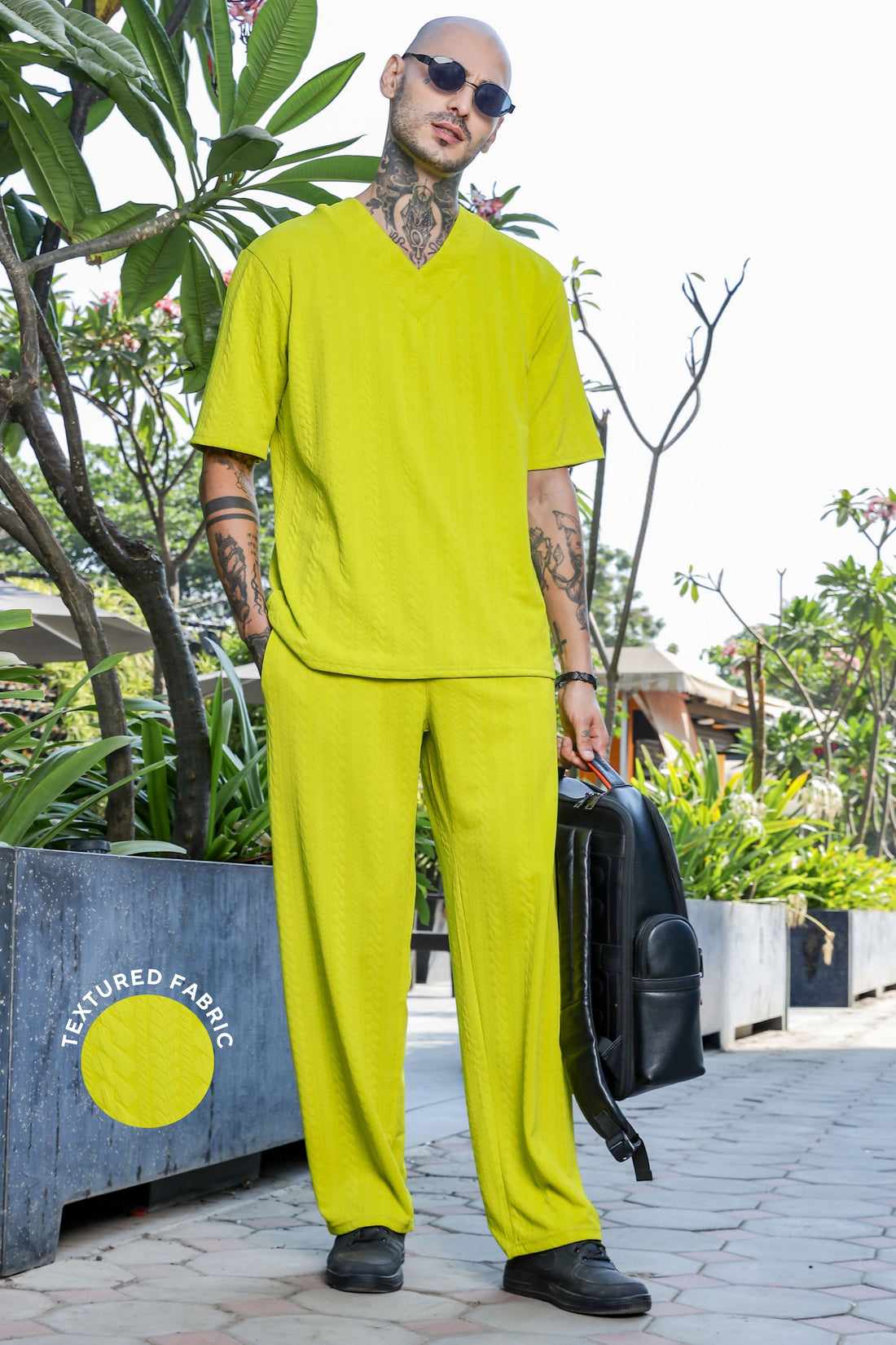 Unisex Lime Green Textured Oversized V-Neck Tee & Trackpant Co-ord Set