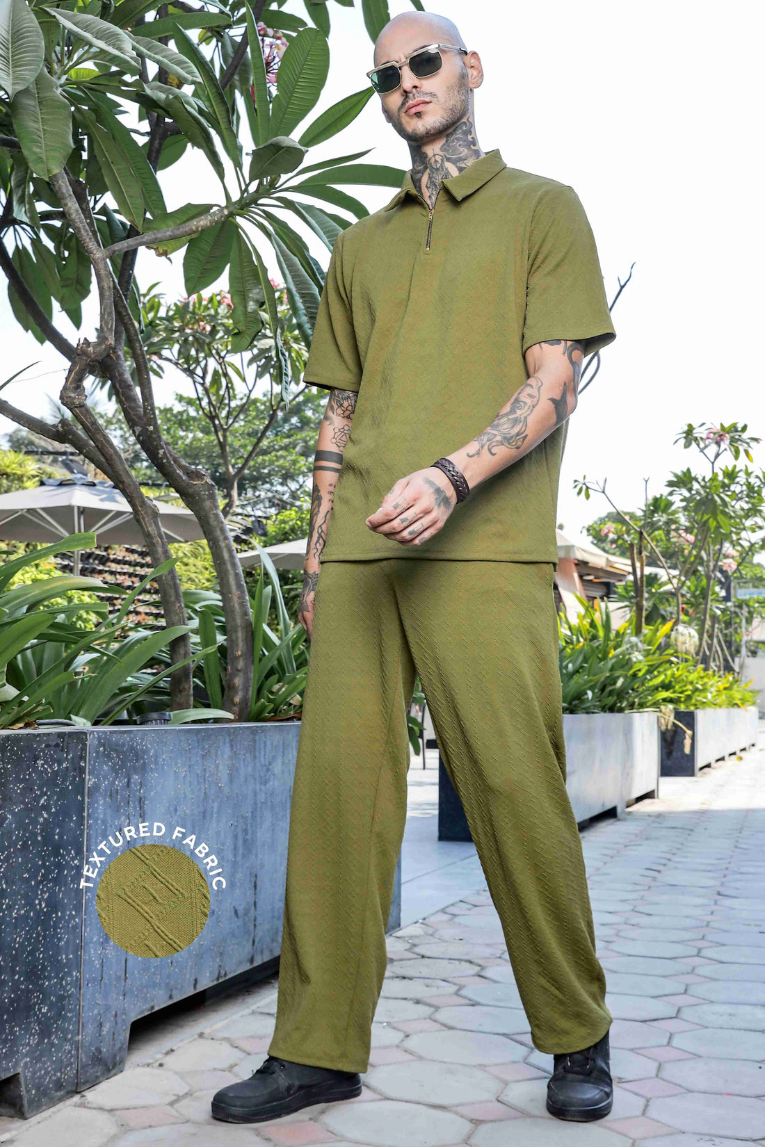 Olive Textured Oversized Polo Neck Tee & Track-pant Co-ord Set