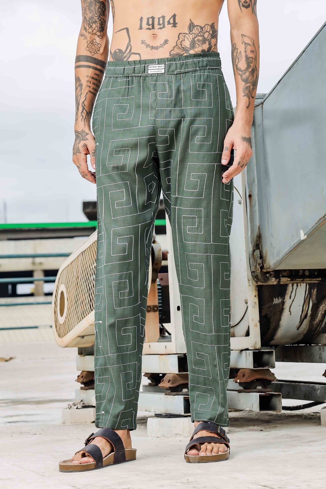 This must have Olive Linen Blend Embroidered fabric mid-rise lounge pants, has an inner elasticated...