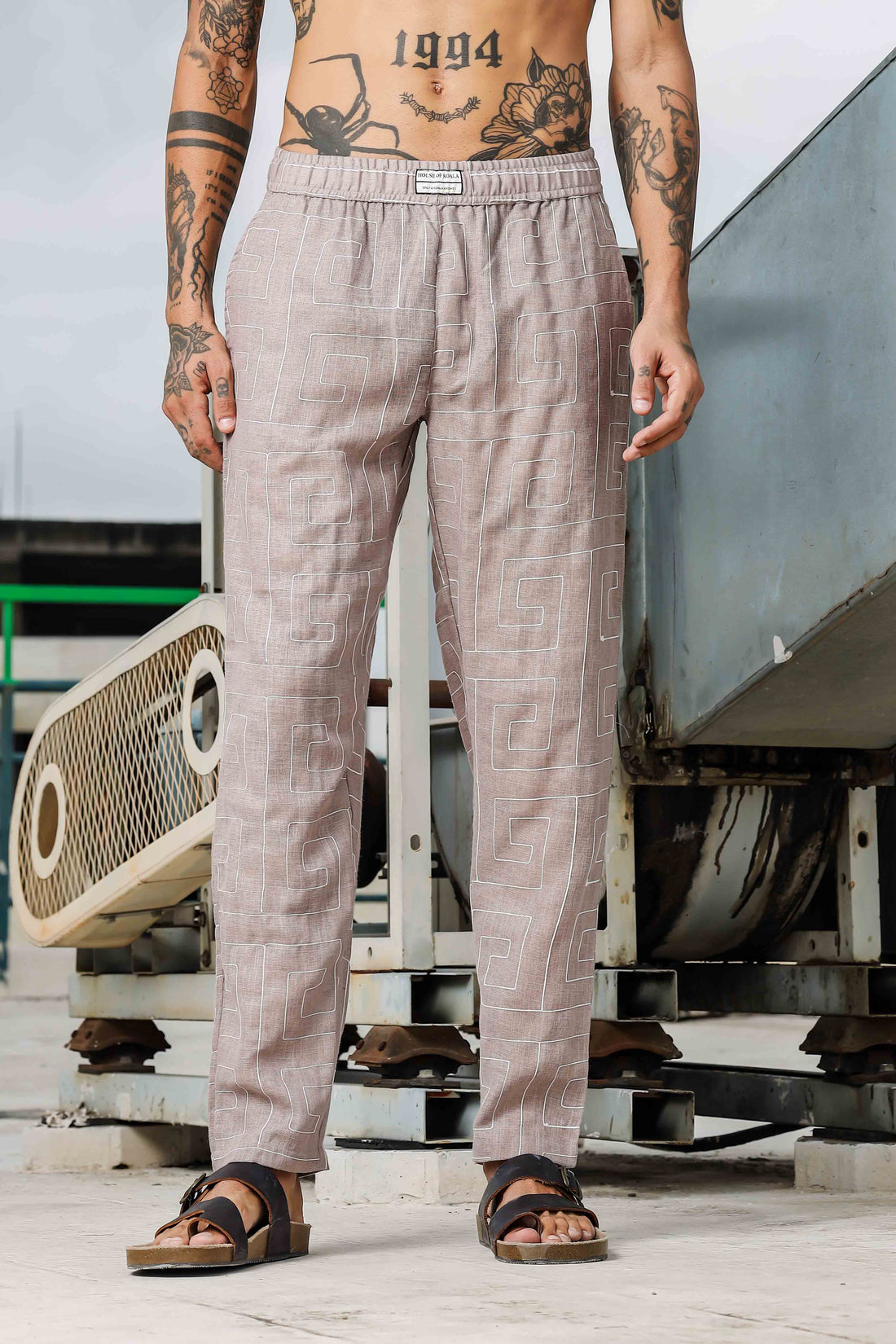 This must have Beige Linen Blend Embroidered fabric mid-rise lounge pants, has an inner elasticated...