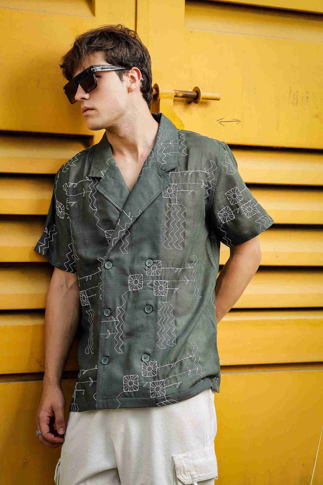 Linen Blend Embroidered Olive Korean Cuban Collar Resort Shirt
