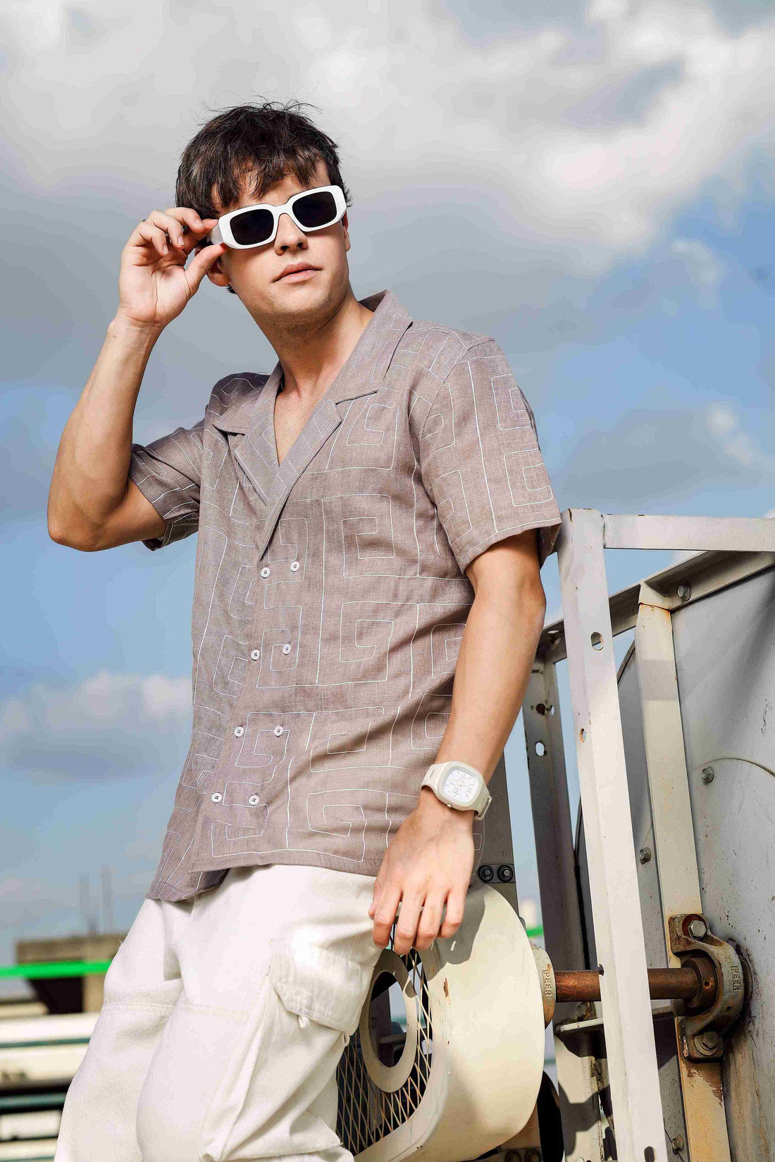 Beige Linen Notched Lapel Shirt & All Day Lounge Pants Embroidered Co-ord Set