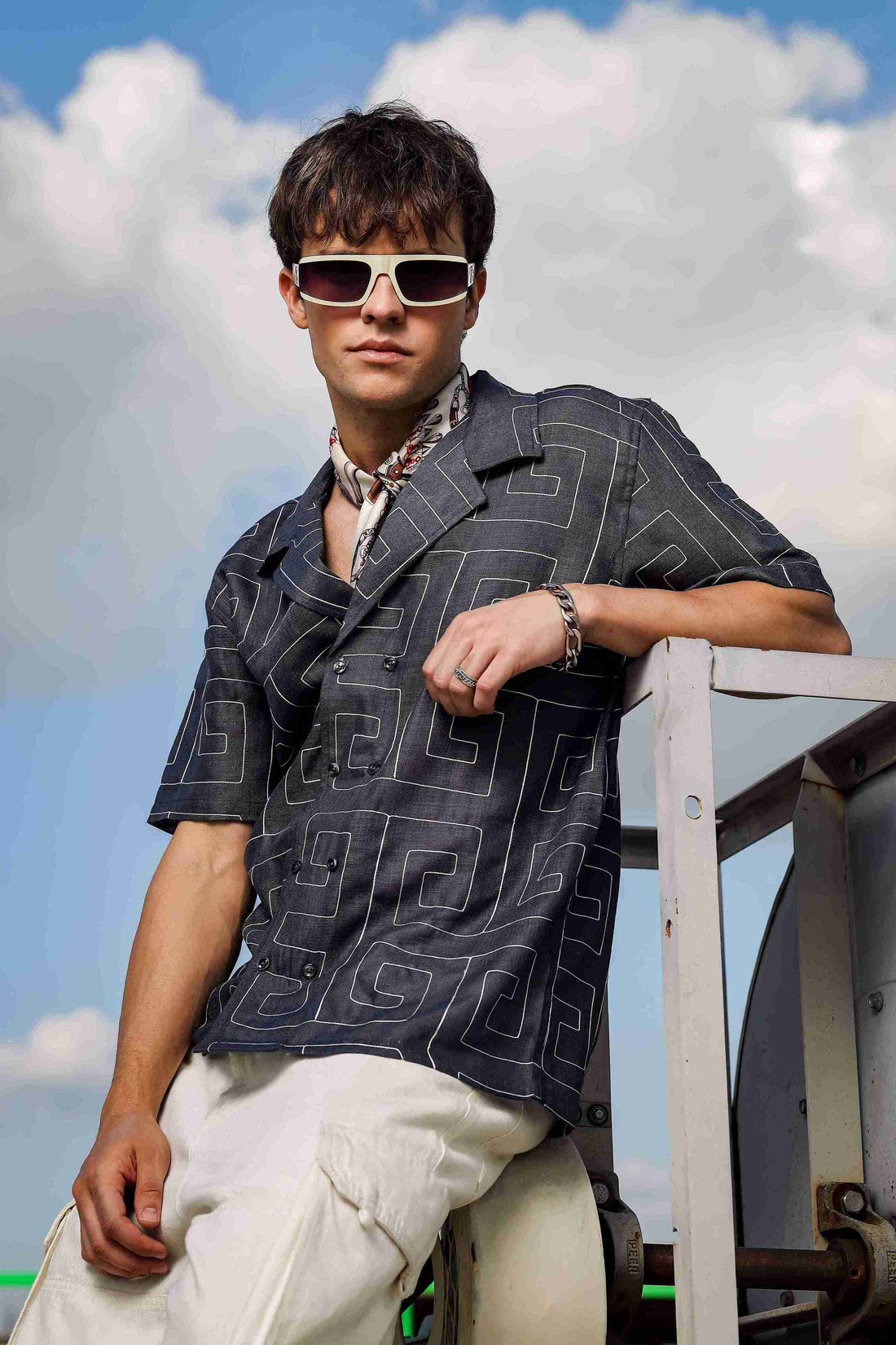 Print - Abstract Conch Tropical Print Fabric- Linen Blend PolyesterColor- GreyCollar - Cuban CollarFit...