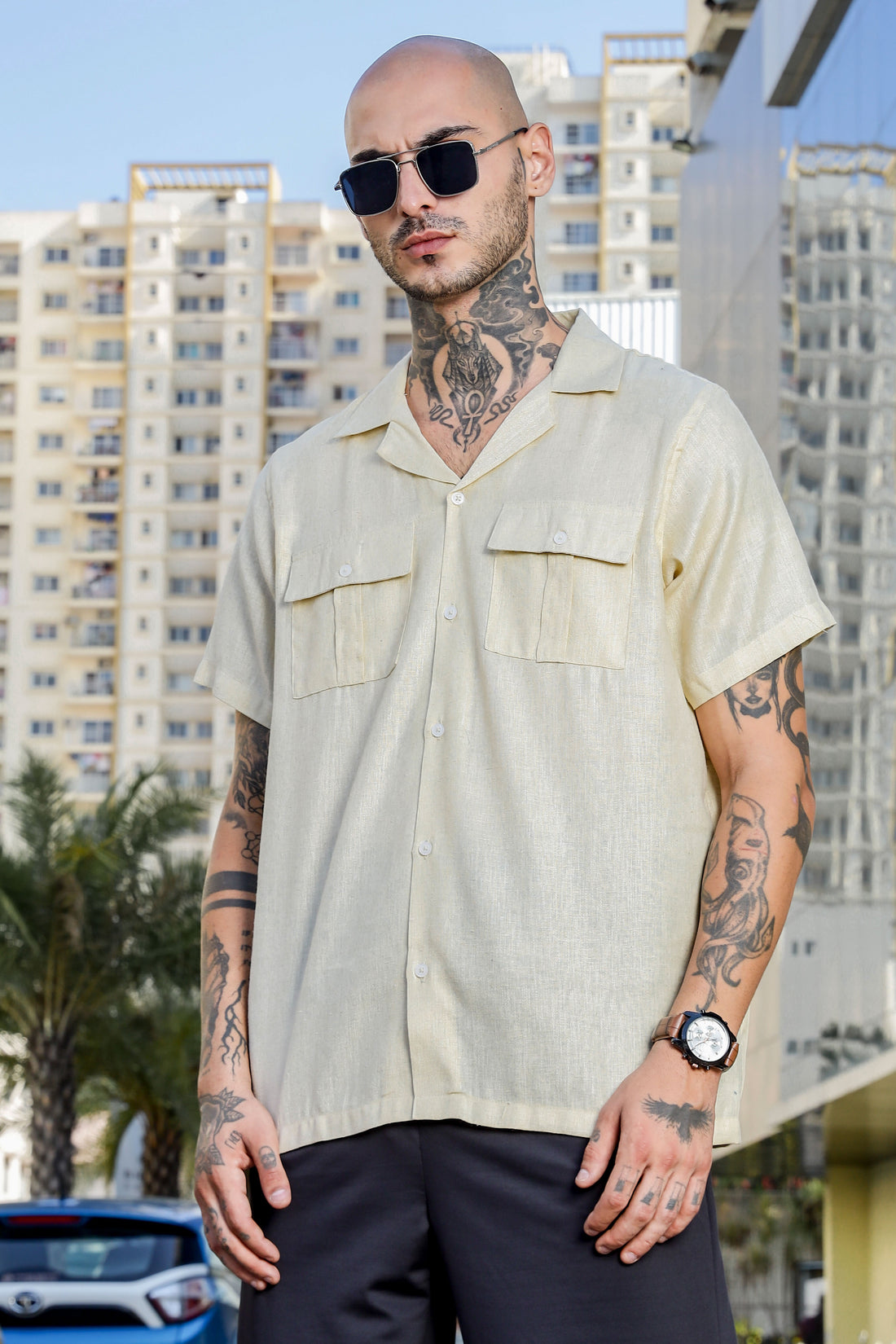 Linen Blend Beige Cuban Collar Classic Relaxed Fit Shirt