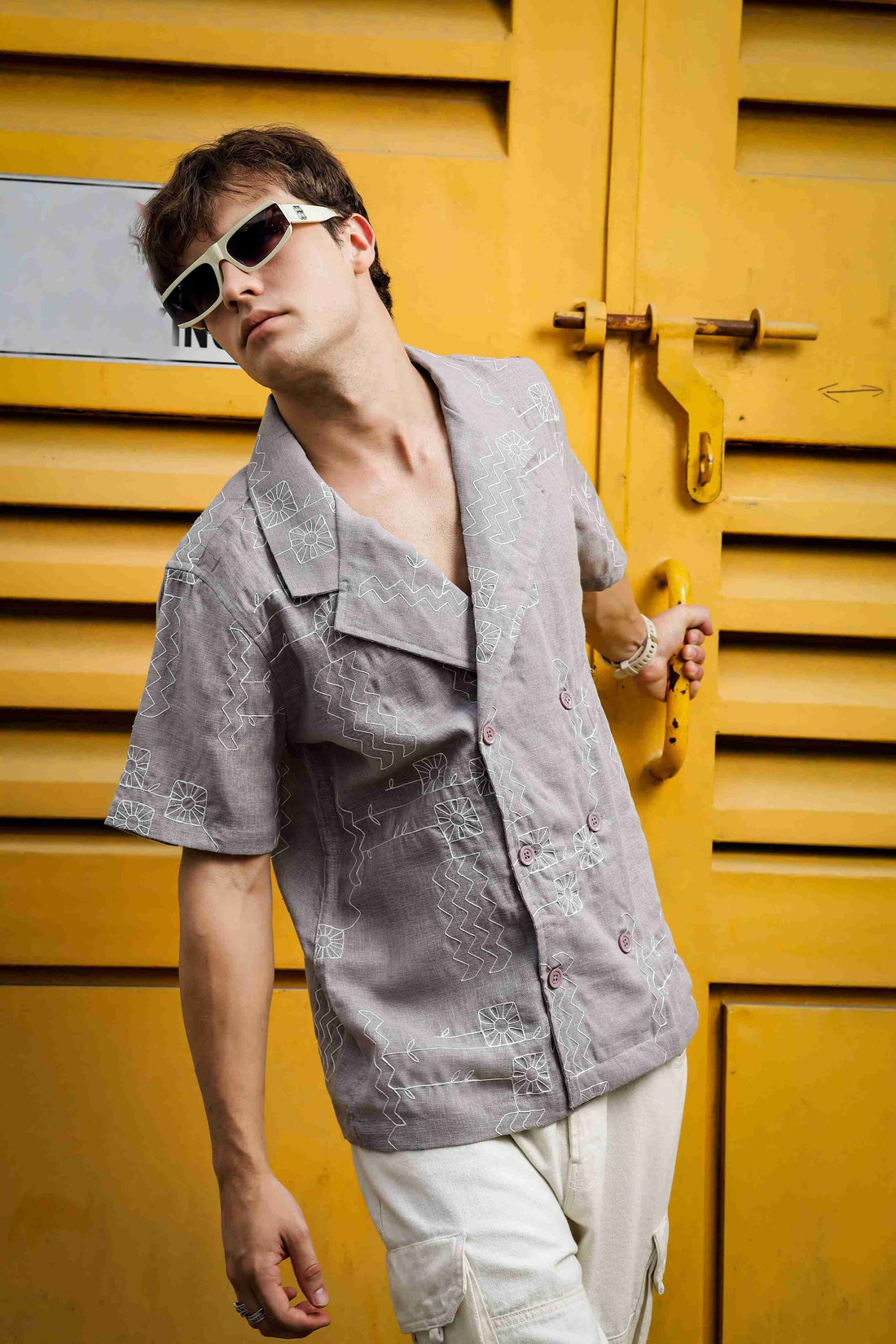 Grey Linen Blend Embroidered Korean Notched Lapel Collar Oversized Fit Shirt