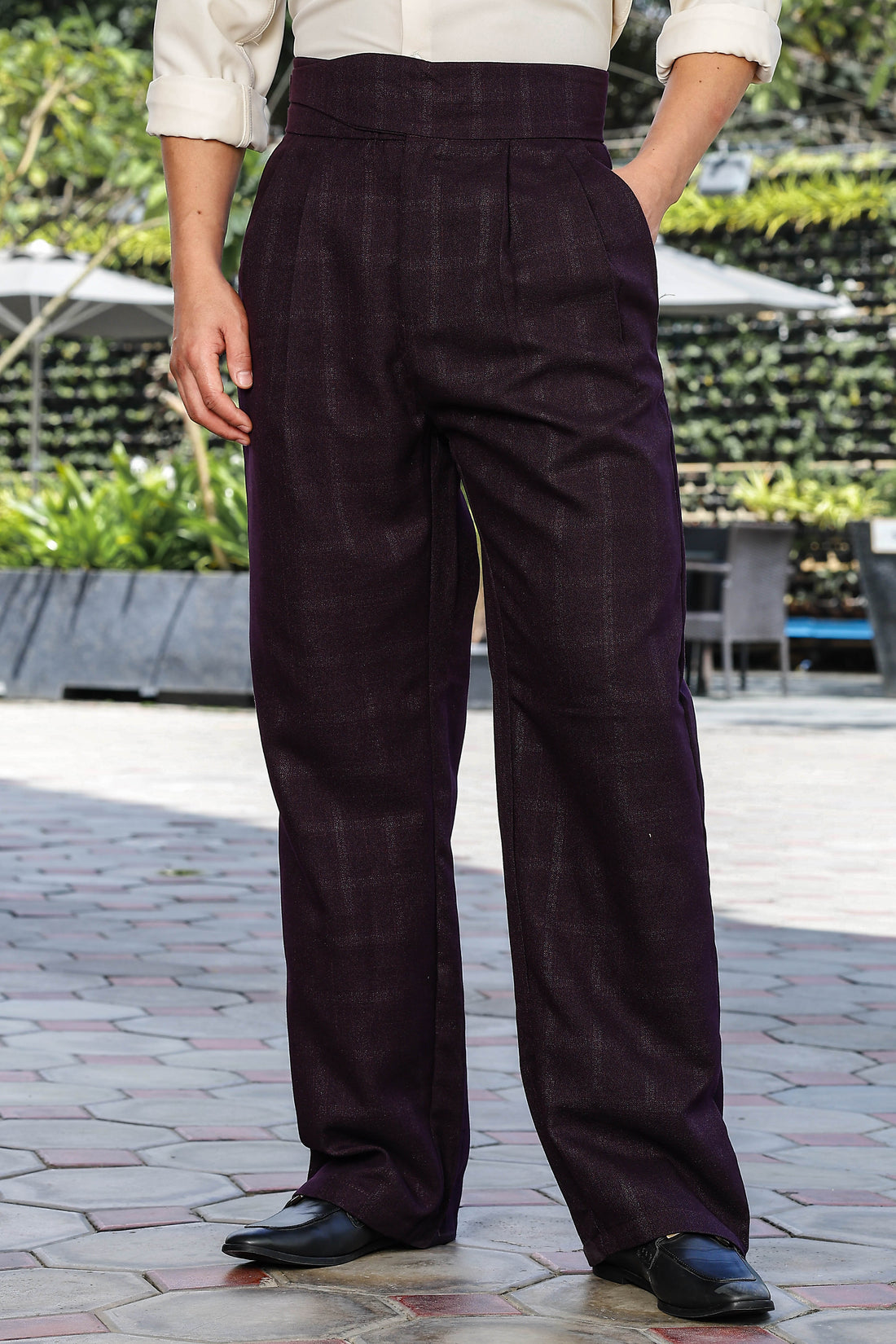 -Gurkha Waistband Design-Fabric:Premium PolyTweed-Double Pleated Front Detailing -Relaxed Fit with Wide Tapered Legs -Versatile Styling-Mid-Rise Waist -Color:Wine Model...