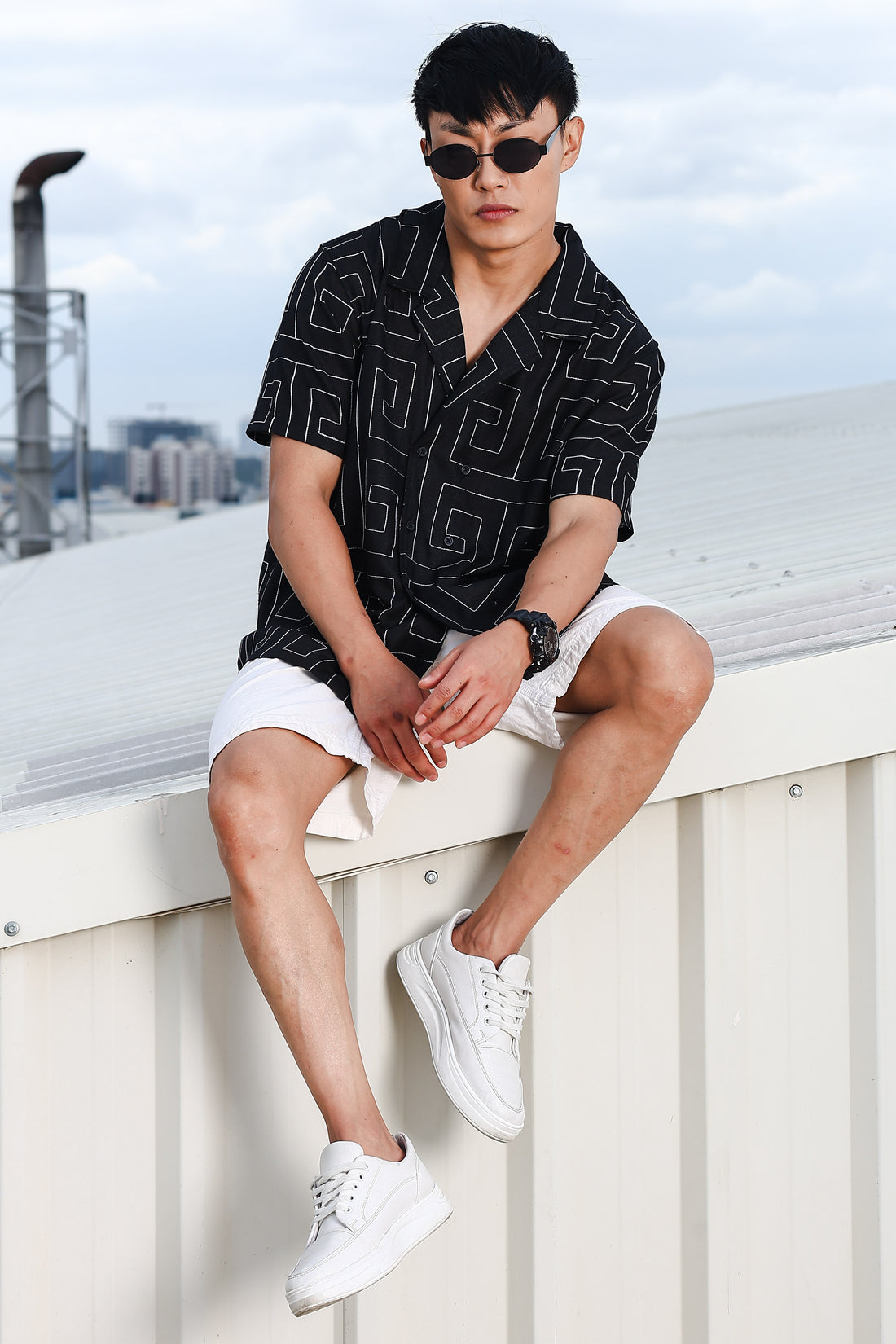 Black Linen Embroidered Notched Lapel Korean Shirt & All Day Pants Co-ord Set