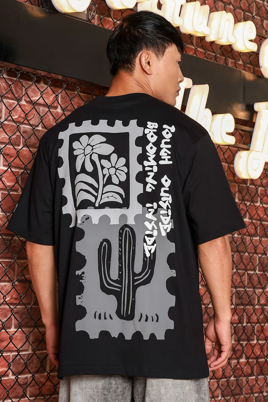 Black Oversized Printed Drop-Shoulder Sleeve Pure Cotton T-shirt