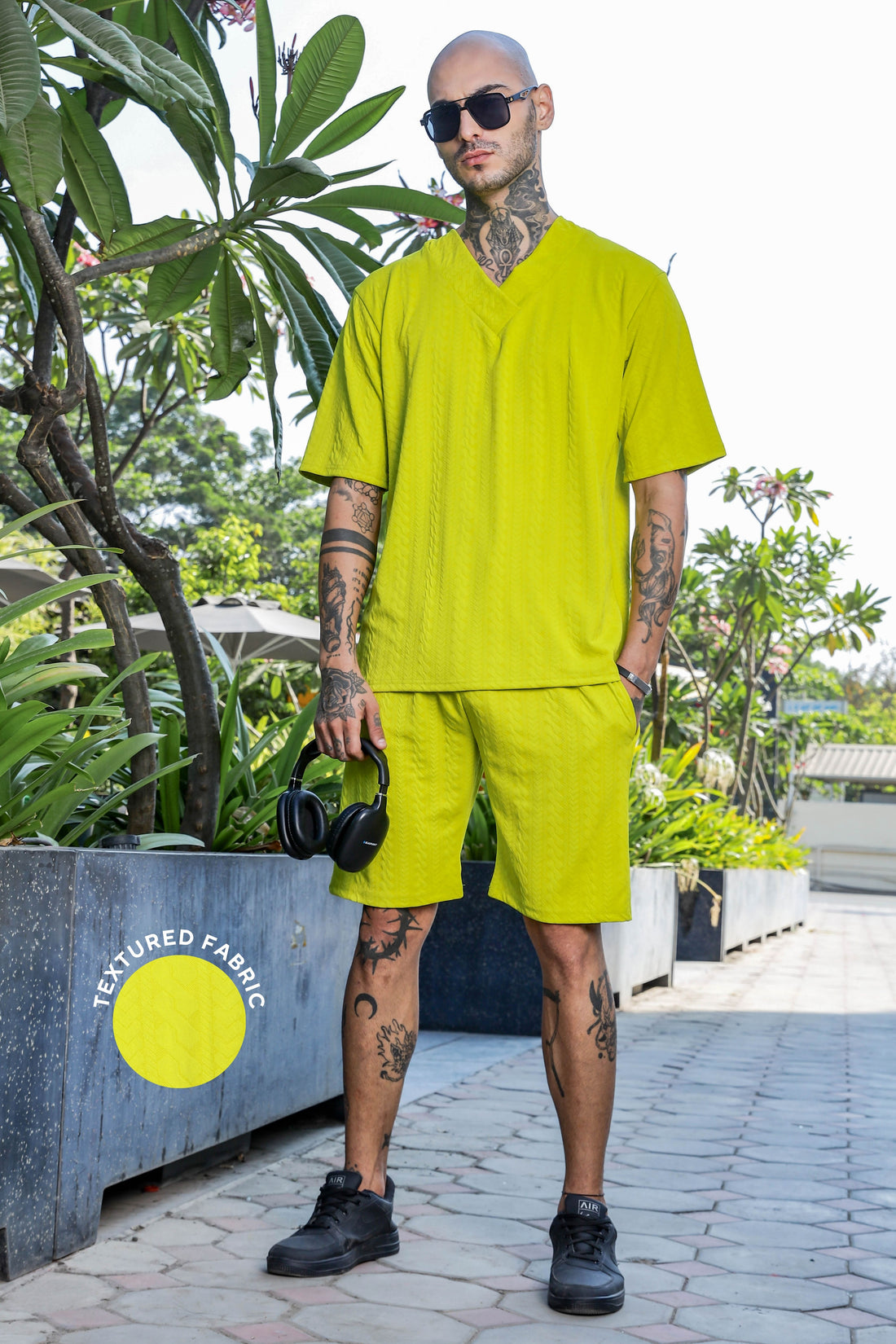 Unisex Lime Green Textured Oversized V-Neck Tee & Shorts Co-ord Set