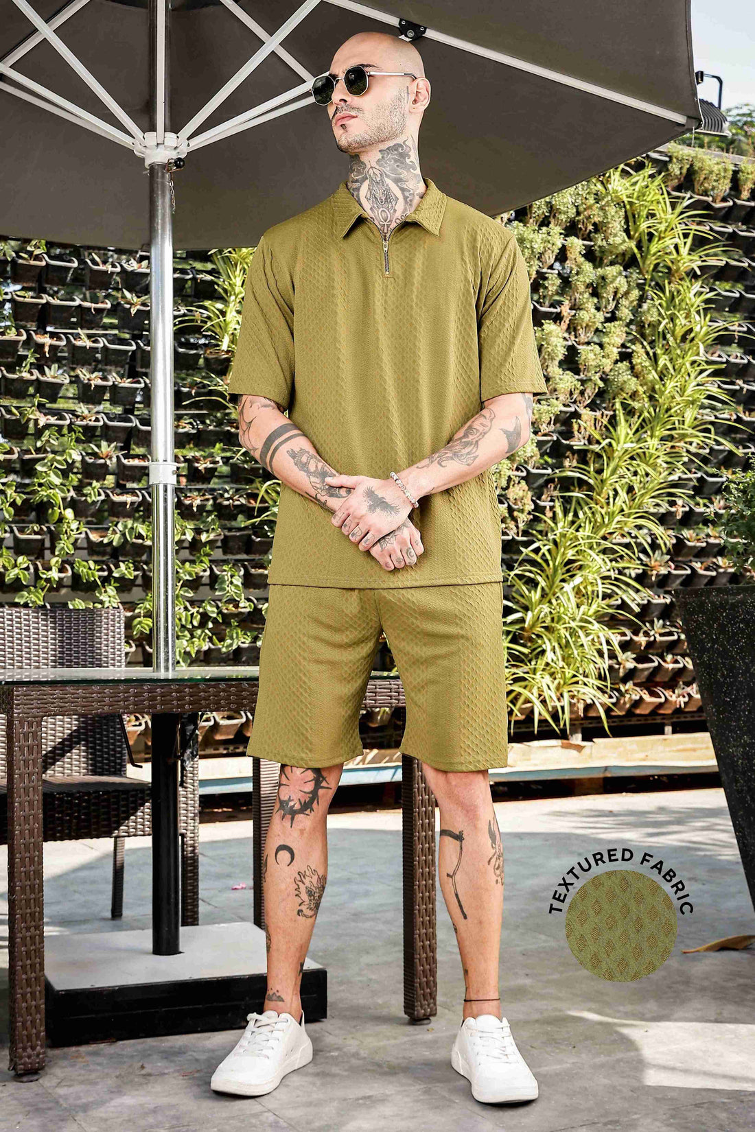 Unisex Olive Textured Oversized Polo Neck Tee & Shorts Co-ord Set