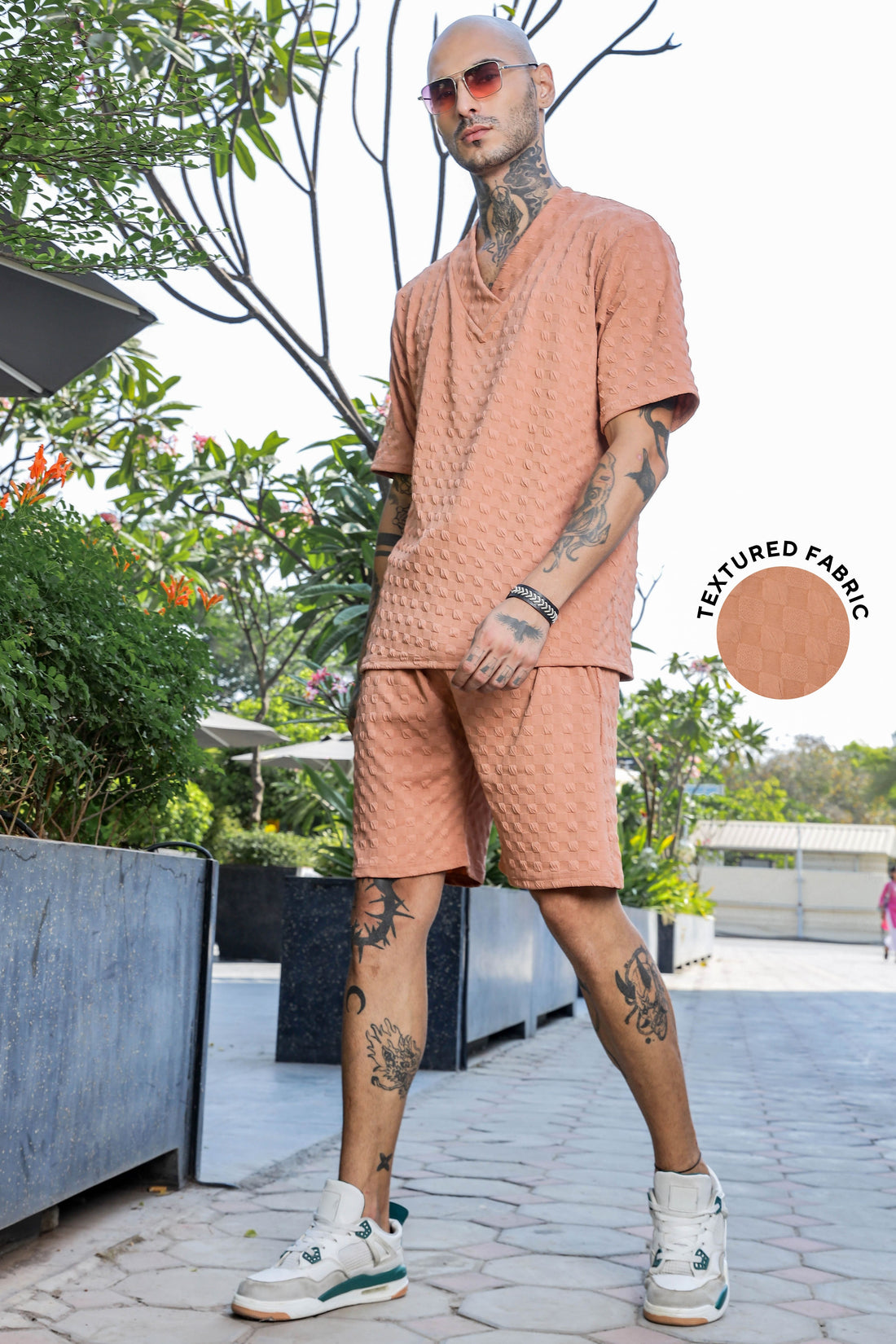 Unisex Brown Textured Oversized V-Neck Tee & Shorts Co-ord Set