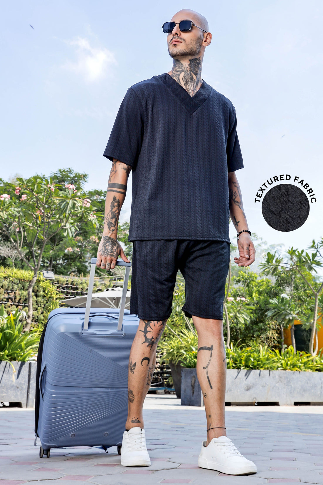 Unisex Black Textured Oversized V-Neck Tee & Shorts Co-ord Set