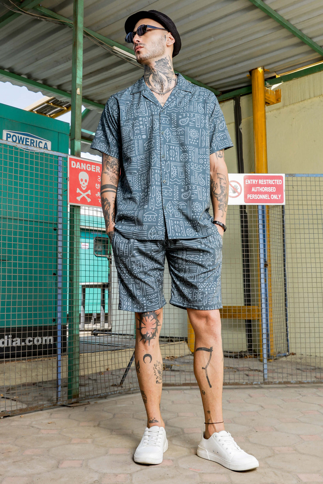 Grey Geometric Printed Cuban Collar Resort Shirt & Shorts Textured Printed Co-ord Set