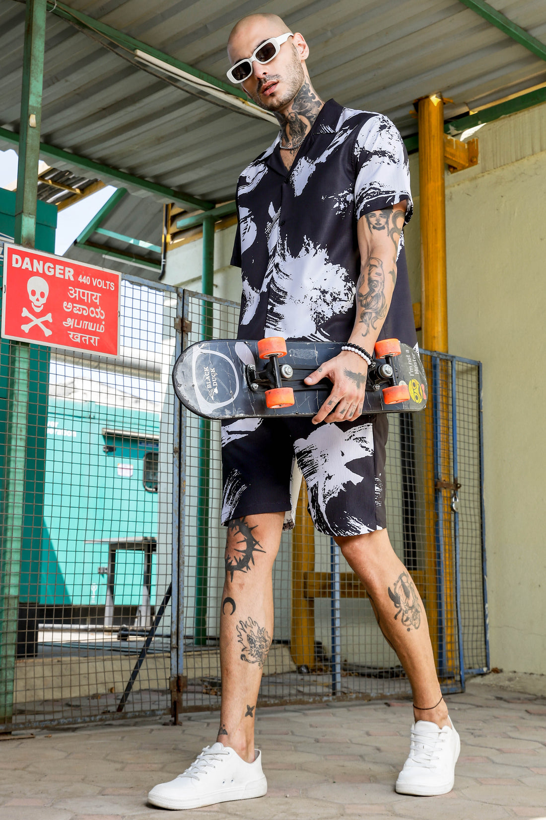 Black Abstract Printed Cuban Collar Resort Shirt & Shorts Textured Co-ord Set