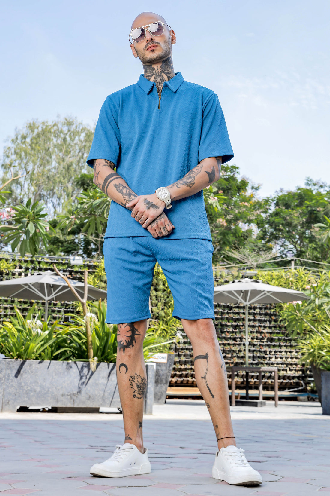Unisex Blue Textured Oversized Polo Neck Tee & Shorts Co-ord Set