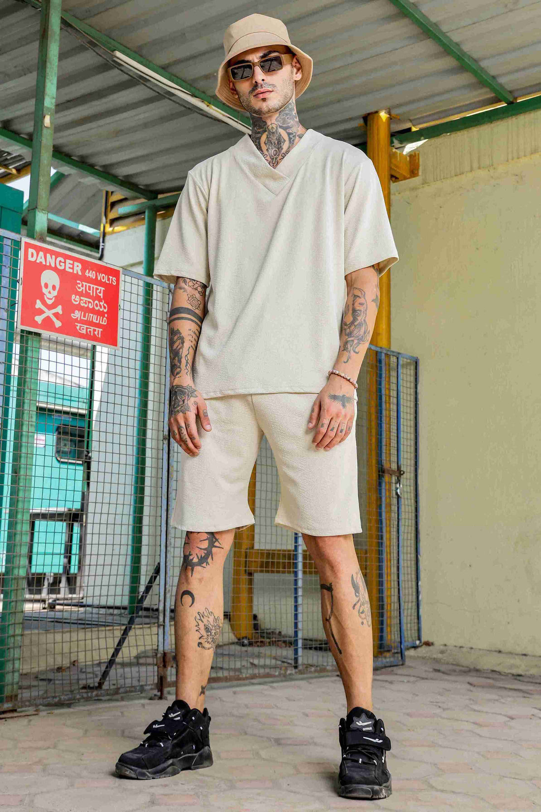 Unisex White Textured Oversized V-Neck Tee & Shorts Co-ord Set