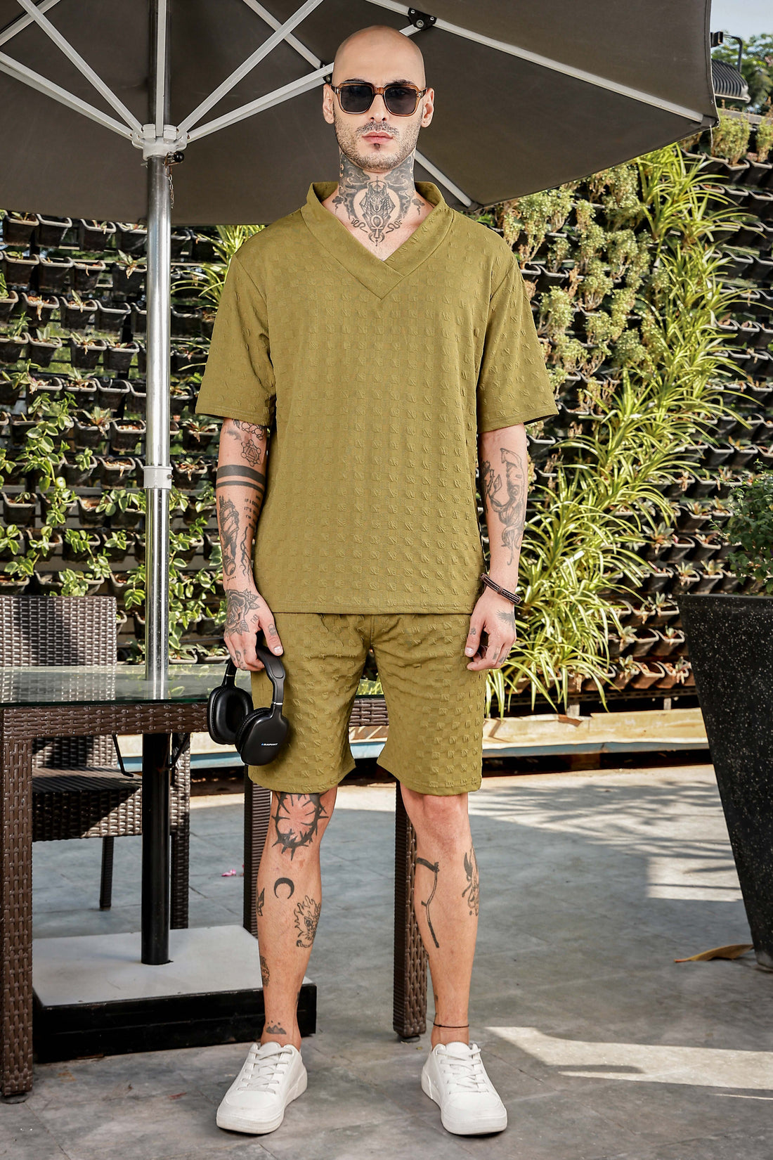 Unisex Olive Textured Oversized V-Neck Tee & Shorts Co-ord Set