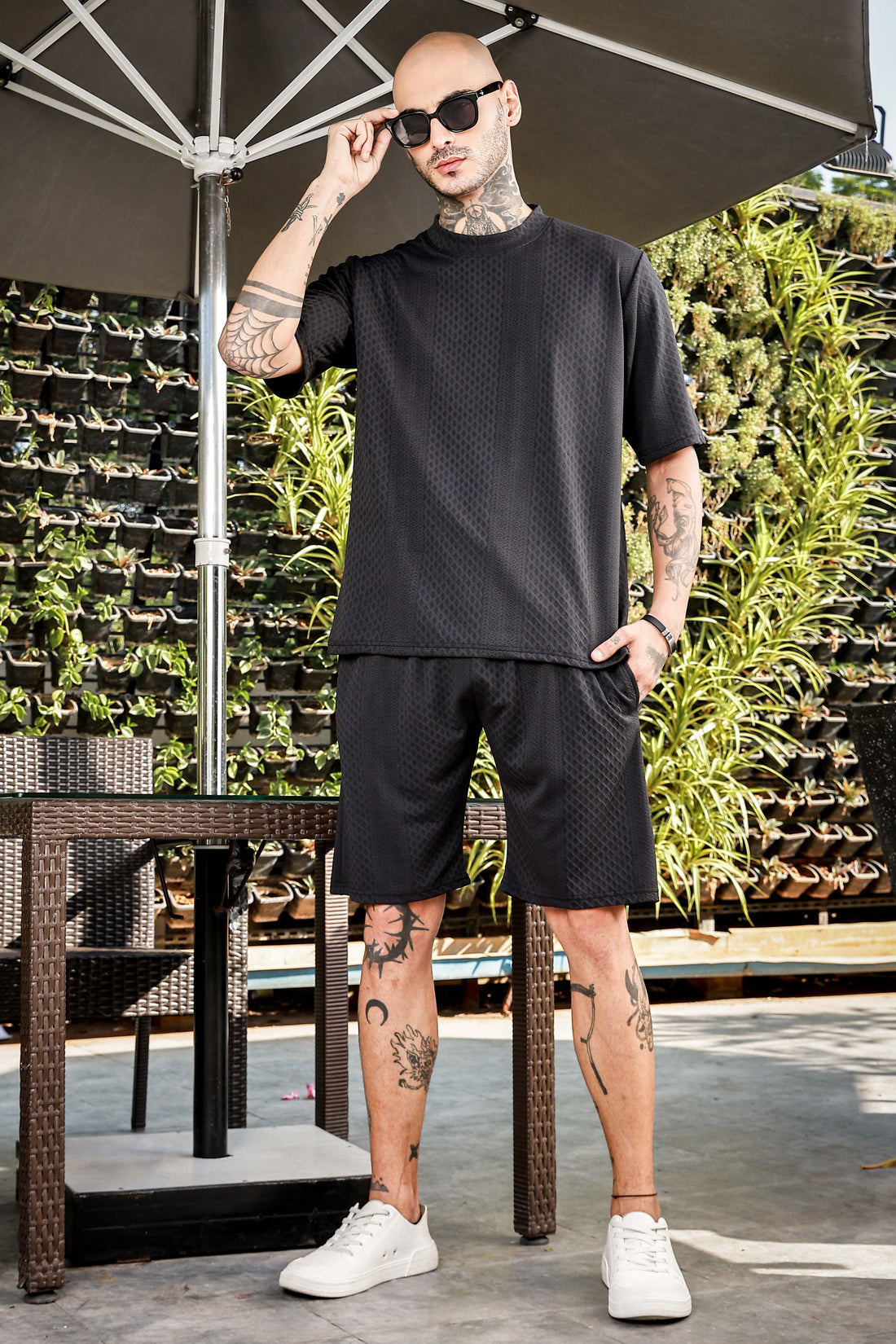 Black Textured Oversized Round Neck Tee & Shorts Co-ord Set
