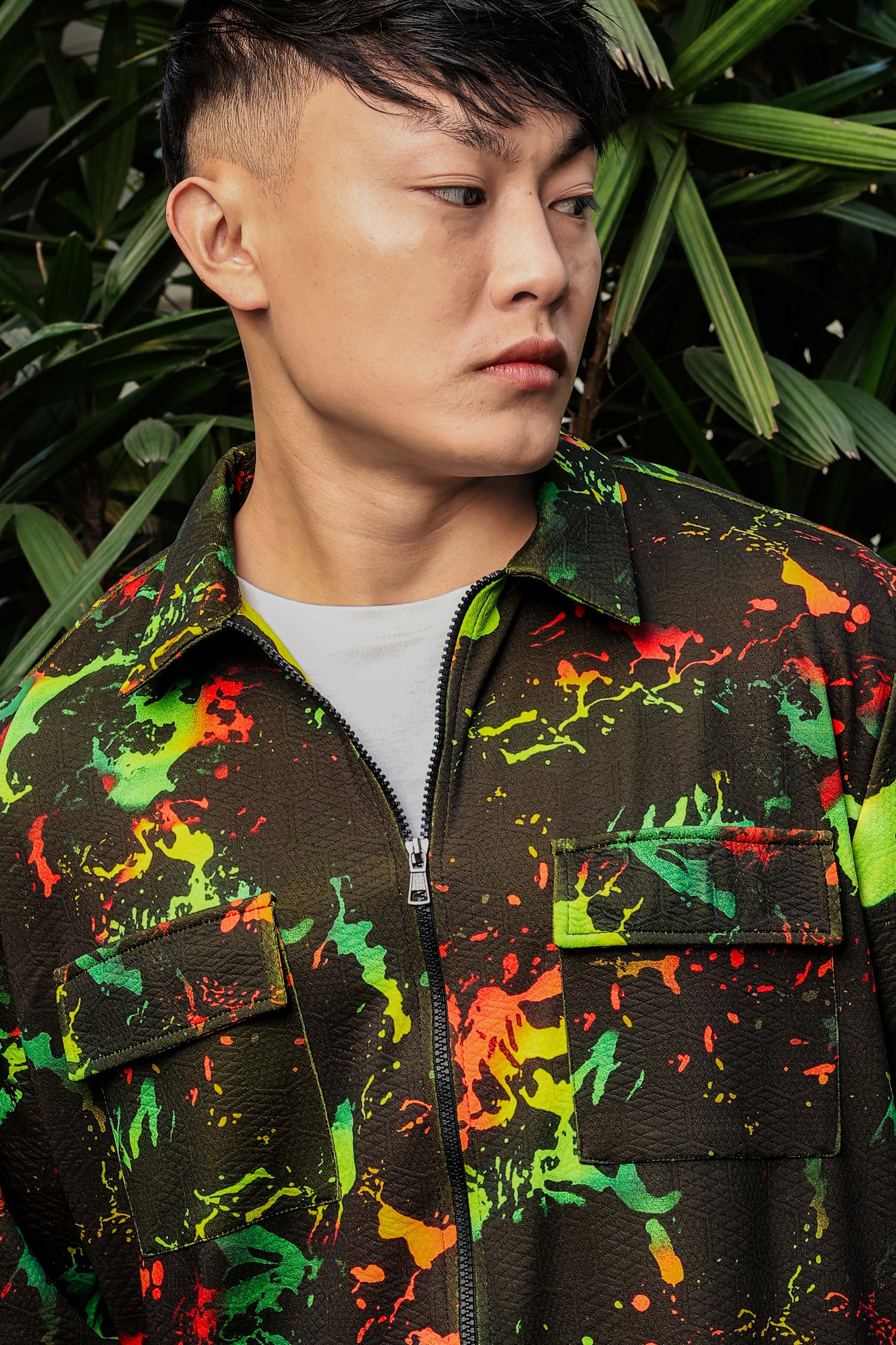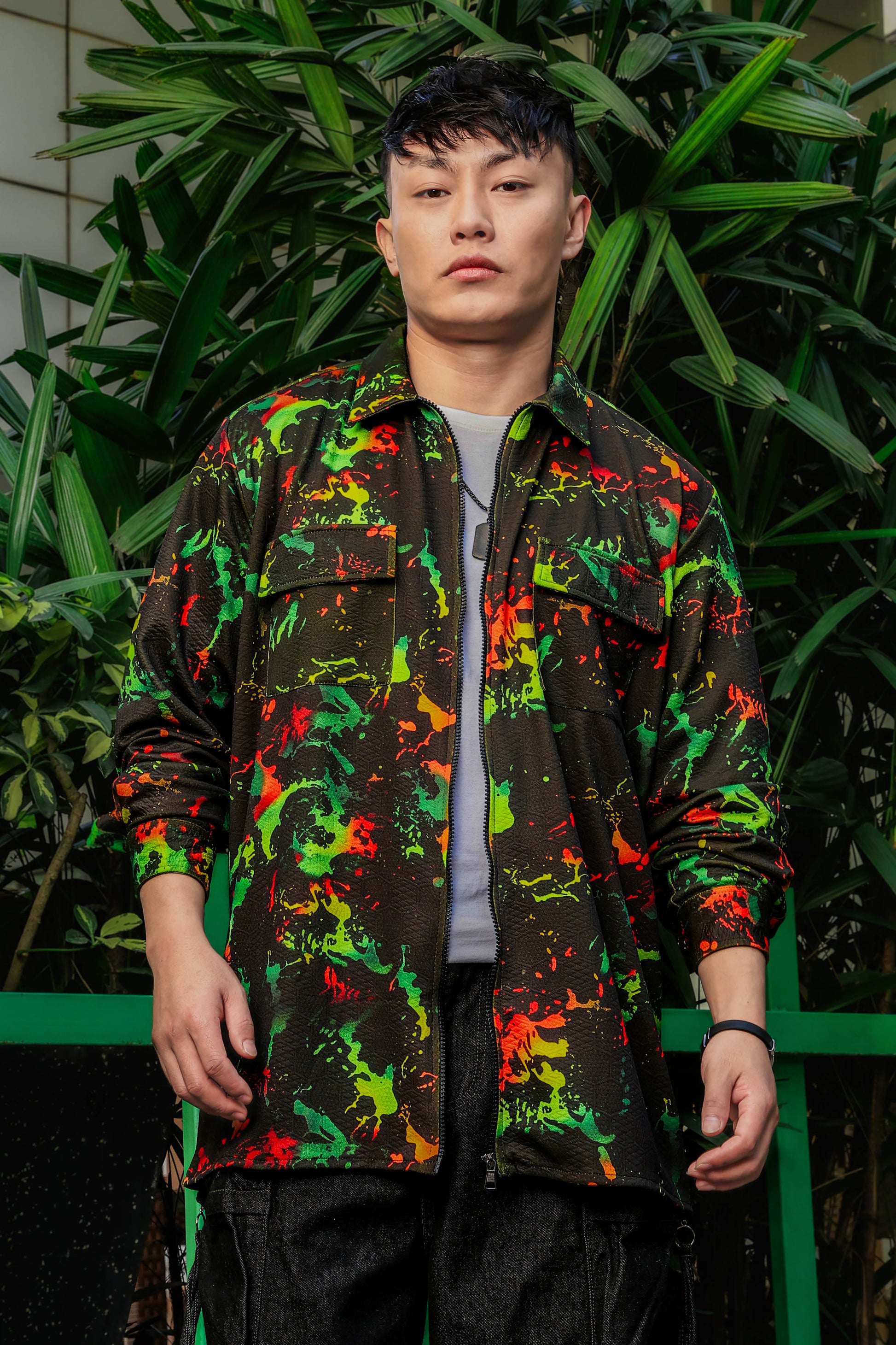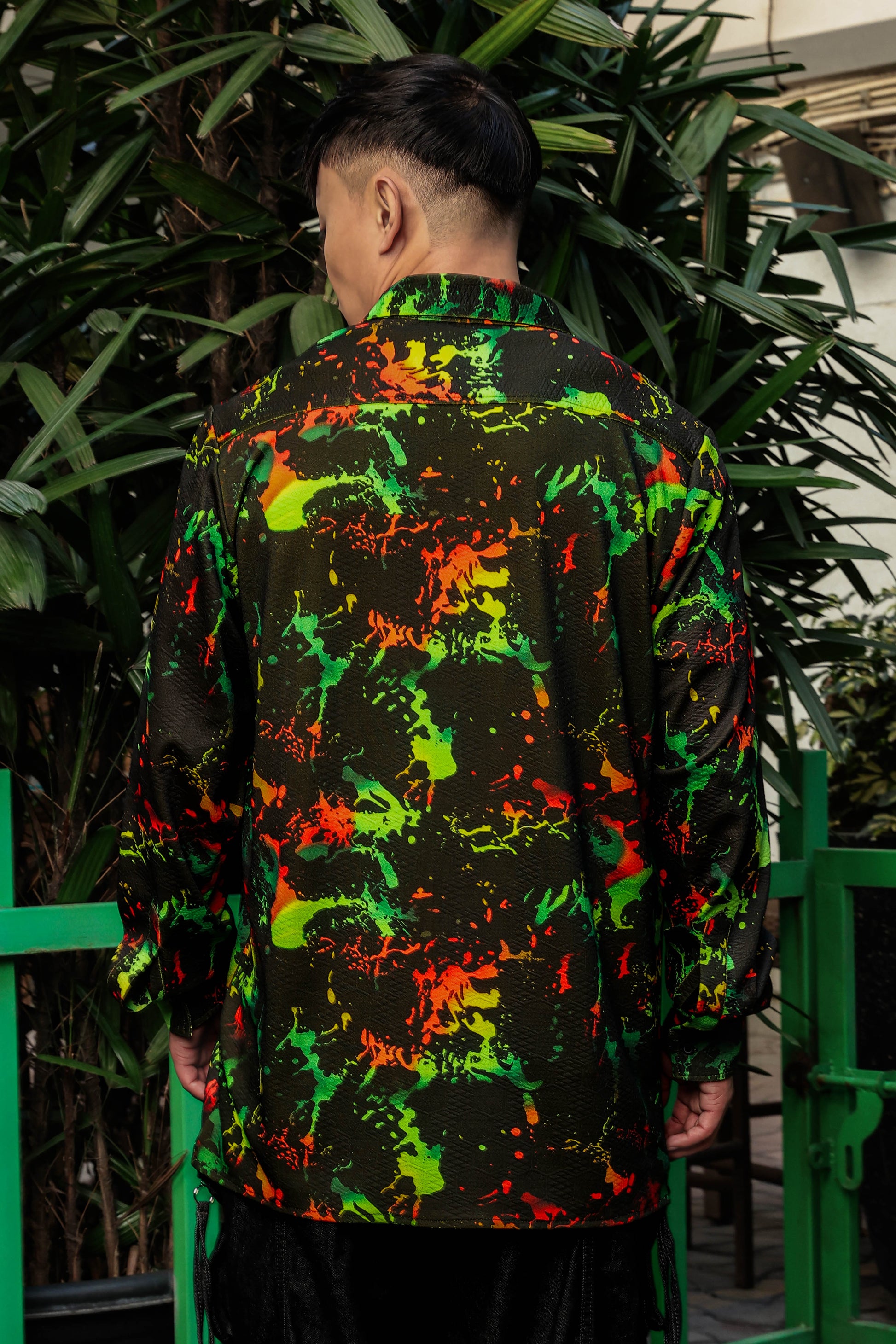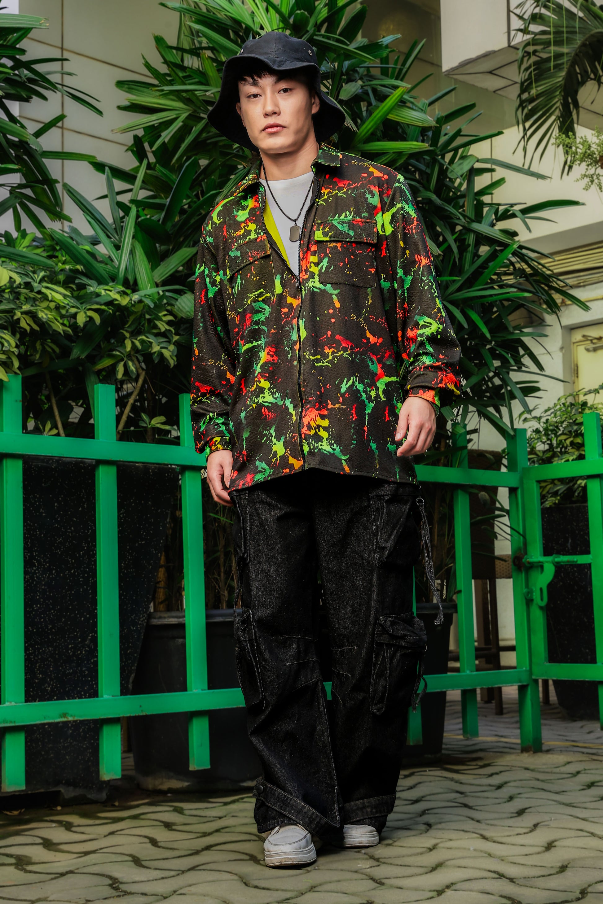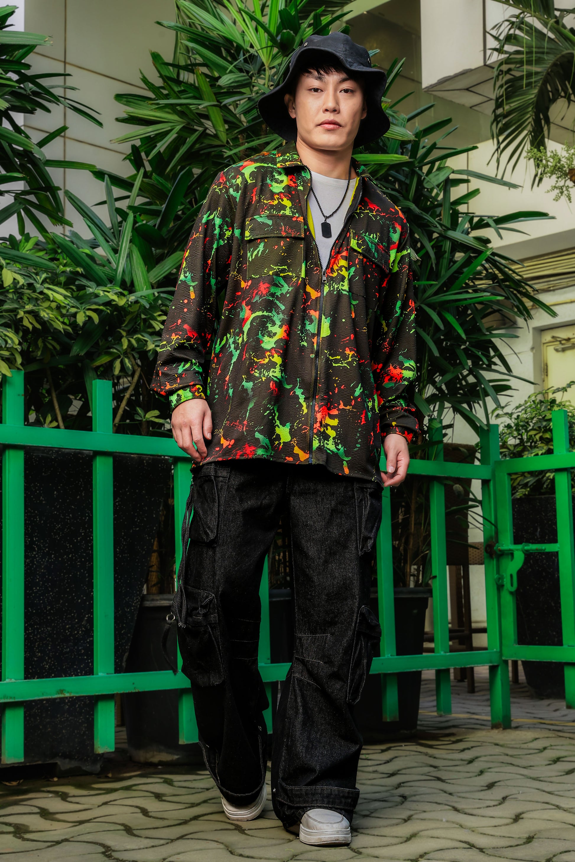 Black Abstract Printed Drop-Shoulder Relaxed Fit Shirt Zipper Shacket