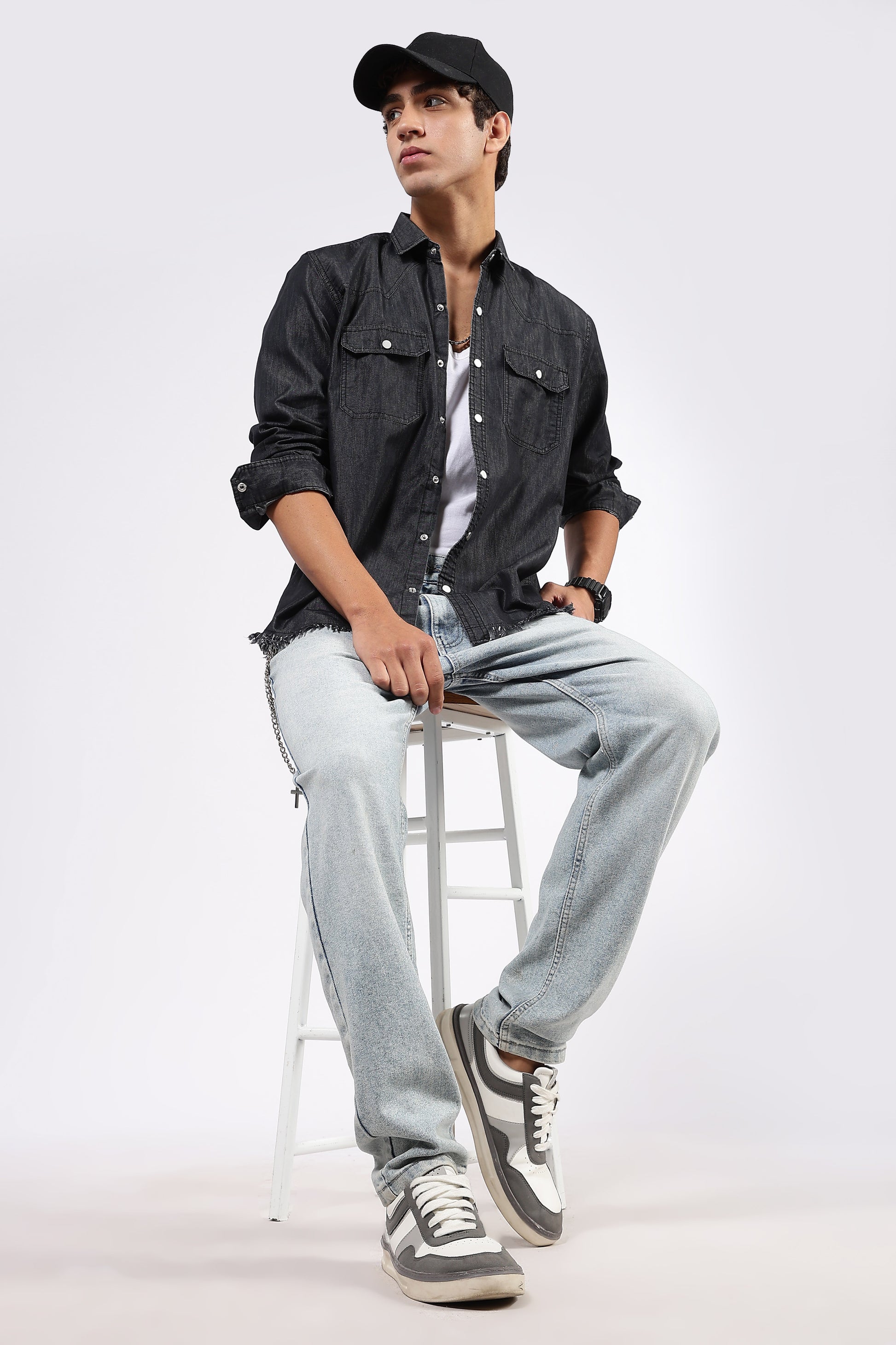 Black Raw Edge Oversized Relaxed Fit Full Sleeve Spread Collar Premium Denim Shirt