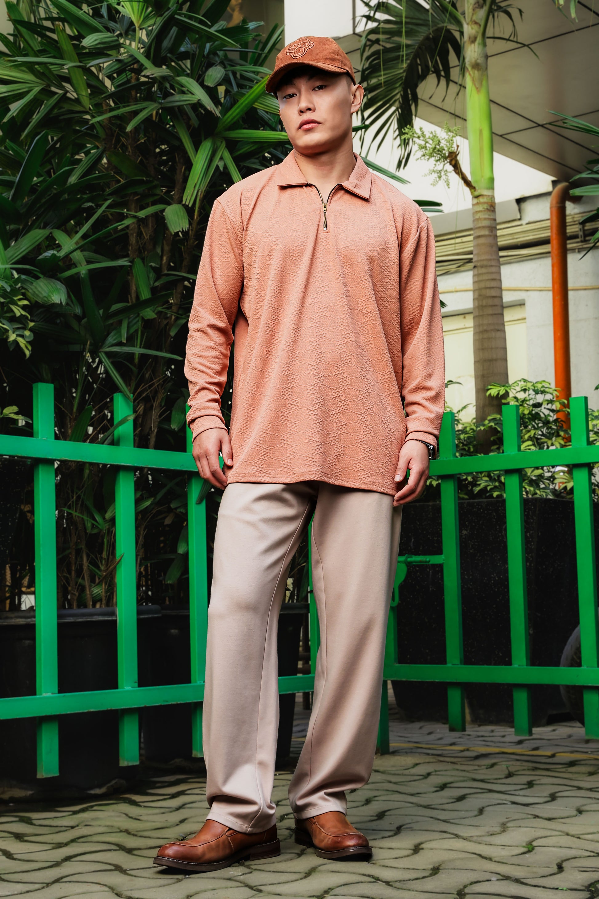 Brown Solid Textured Cable Knit Drop-Shoulder Relaxed Fit Polo Neck Full Sleeve T-Shirt