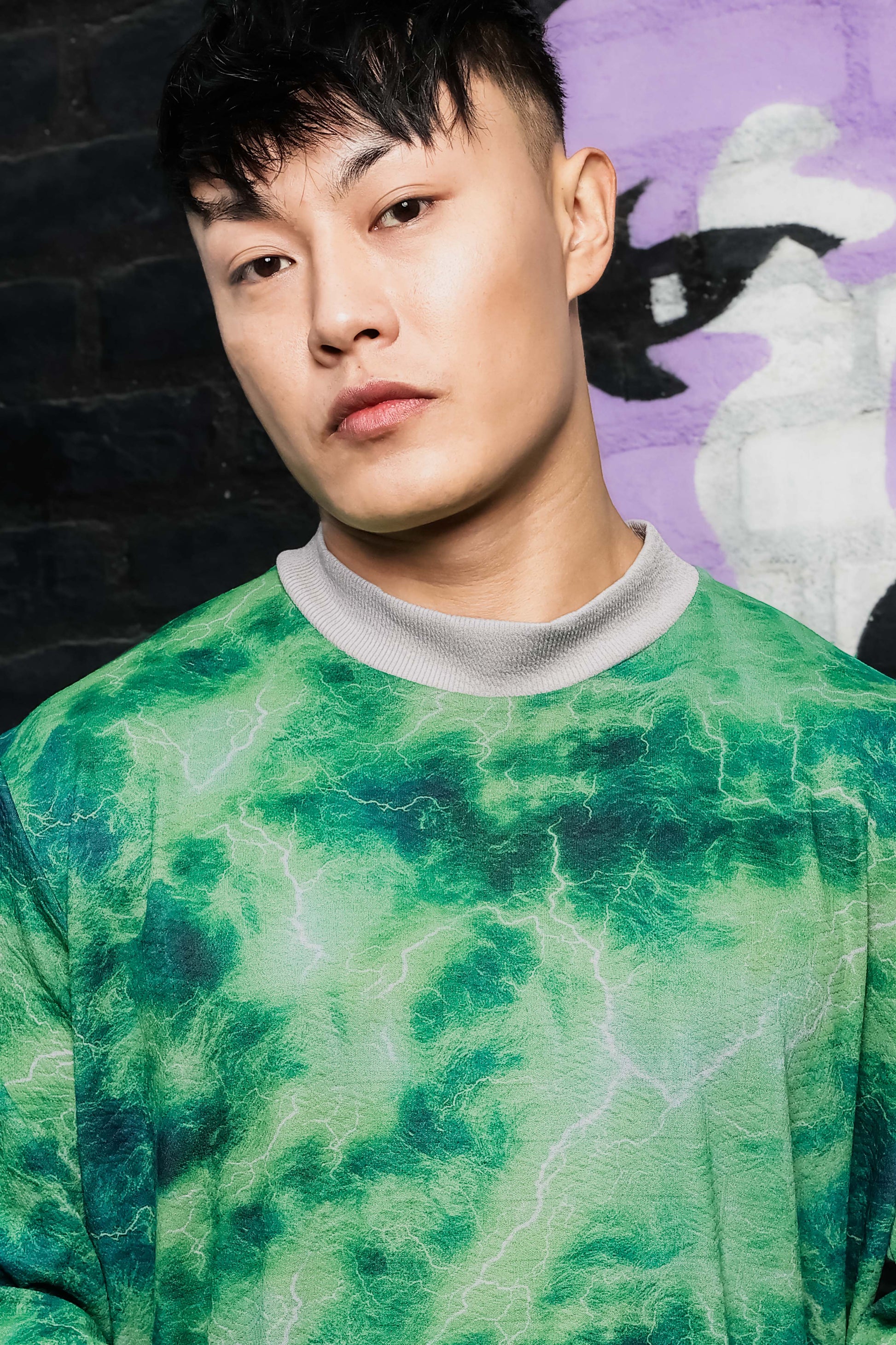 Grey & Green Abstract Printed Drop-Shoulder Relaxed Fit Pullover Sweatshirt