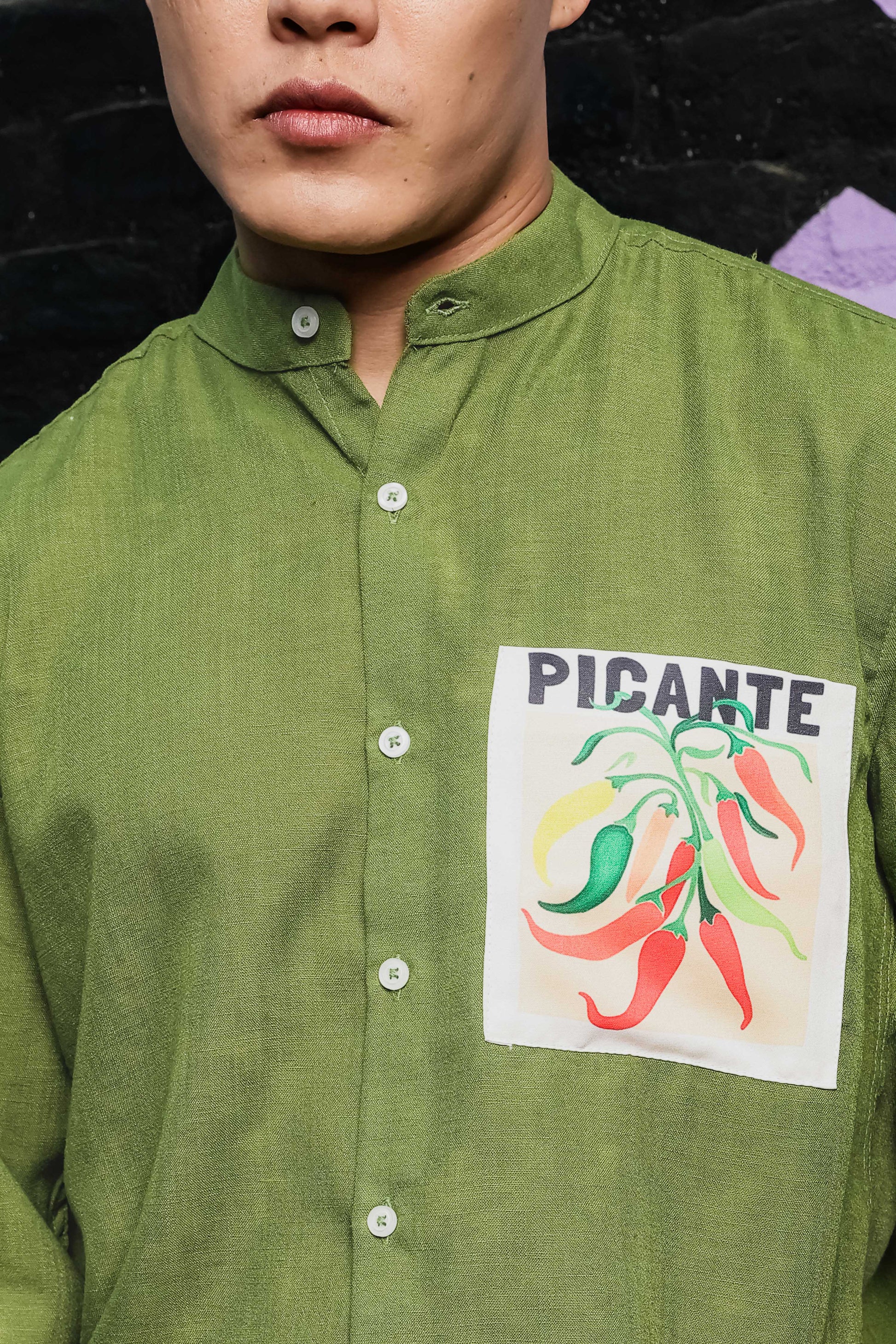 Linen Blend Olive Matcha Mandarin Collar Relaxed Fit Shirt