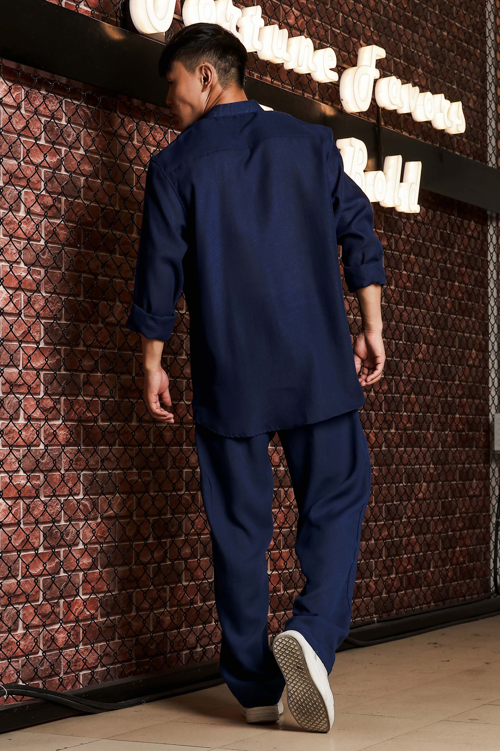 Navy Blue Linen Blend Casual Relaxed Fit Mandarin Collar Shirt & All Day Pants Co-Ord Set