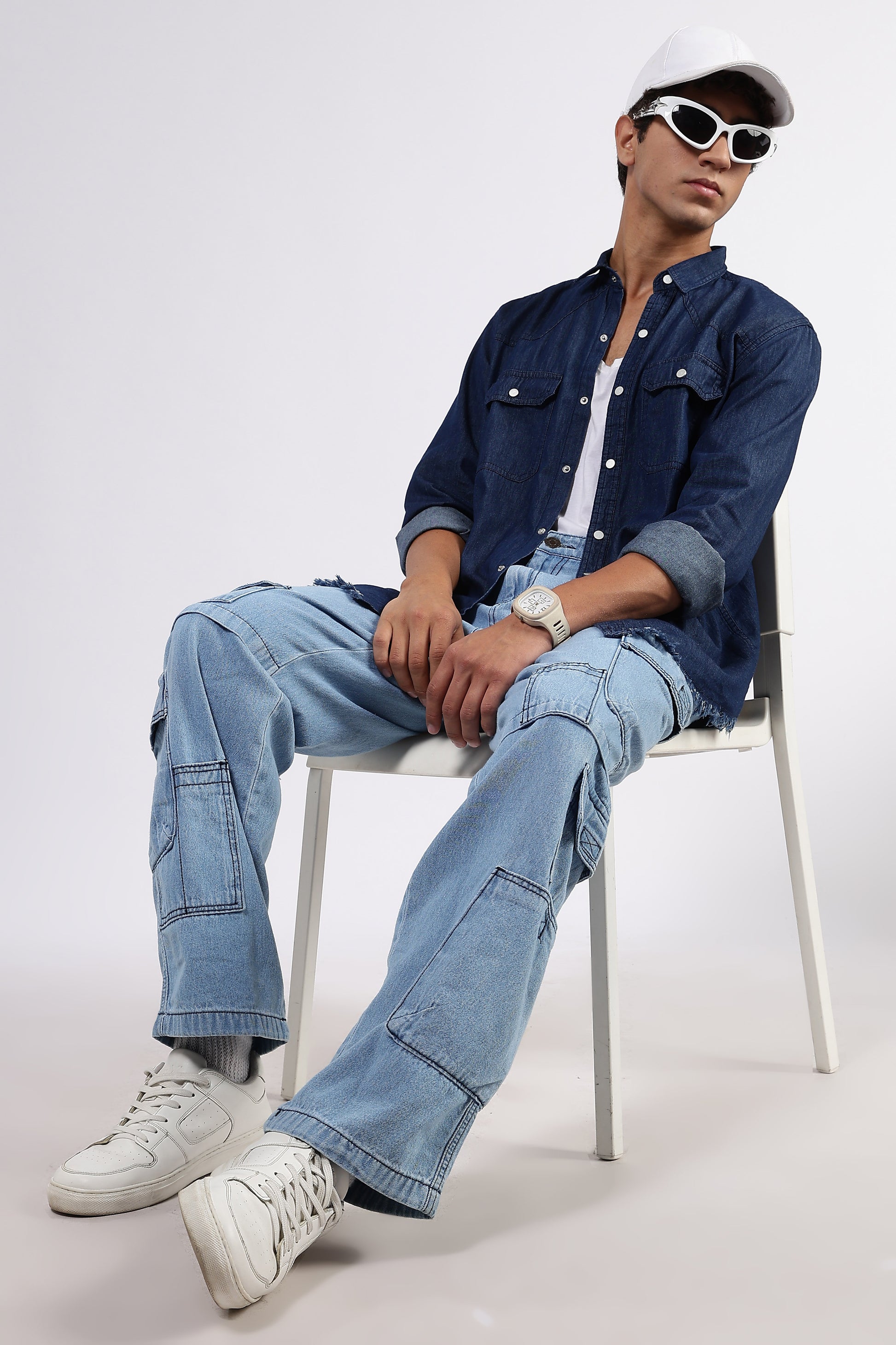 Navy Blue Raw Edge Oversized Relaxed Fit Spread Collar Premium Denim Shirt