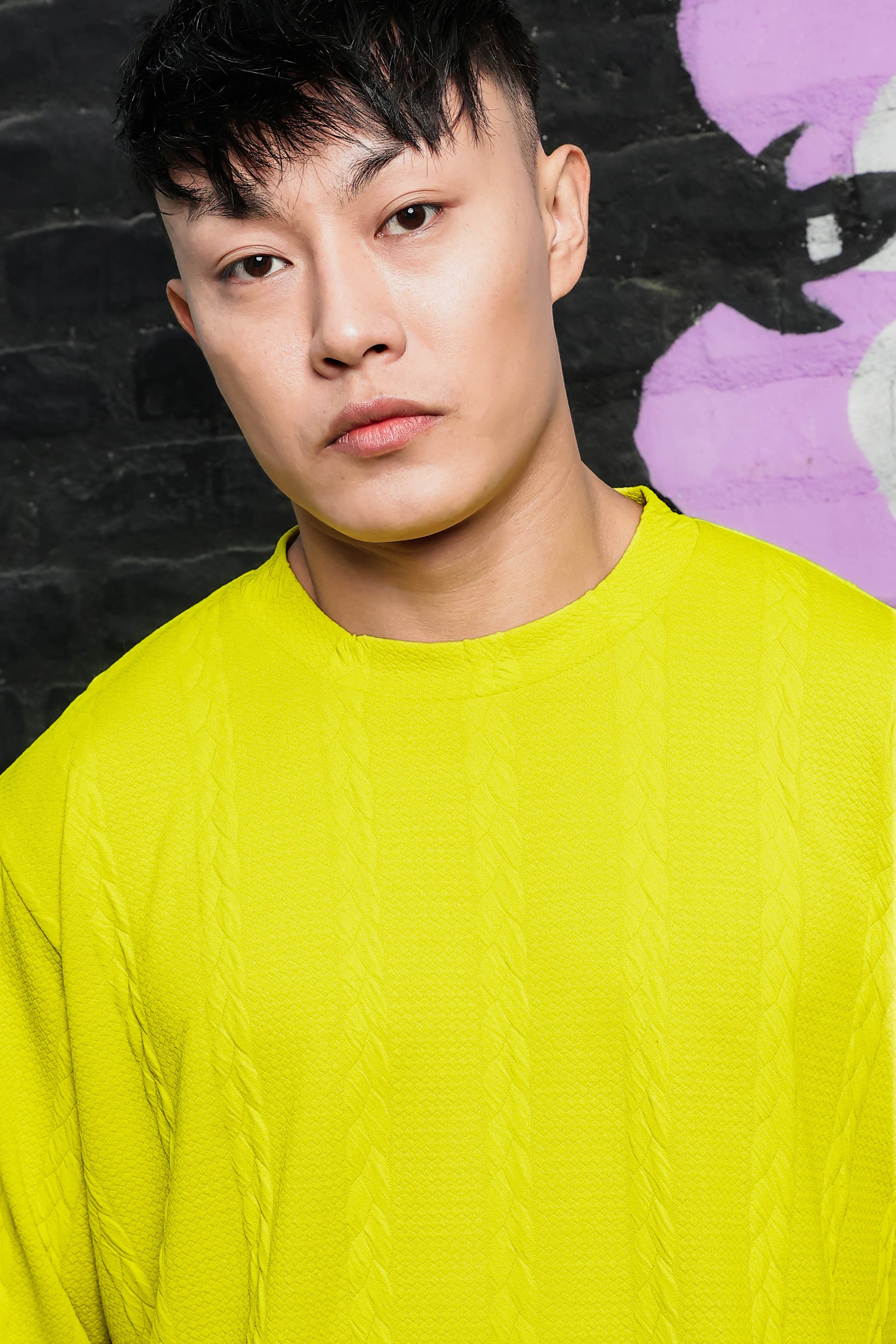 Neon Green Solid Textured Cable Knit Drop-Shoulder Relaxed Fit Pullover Sweatshirt
