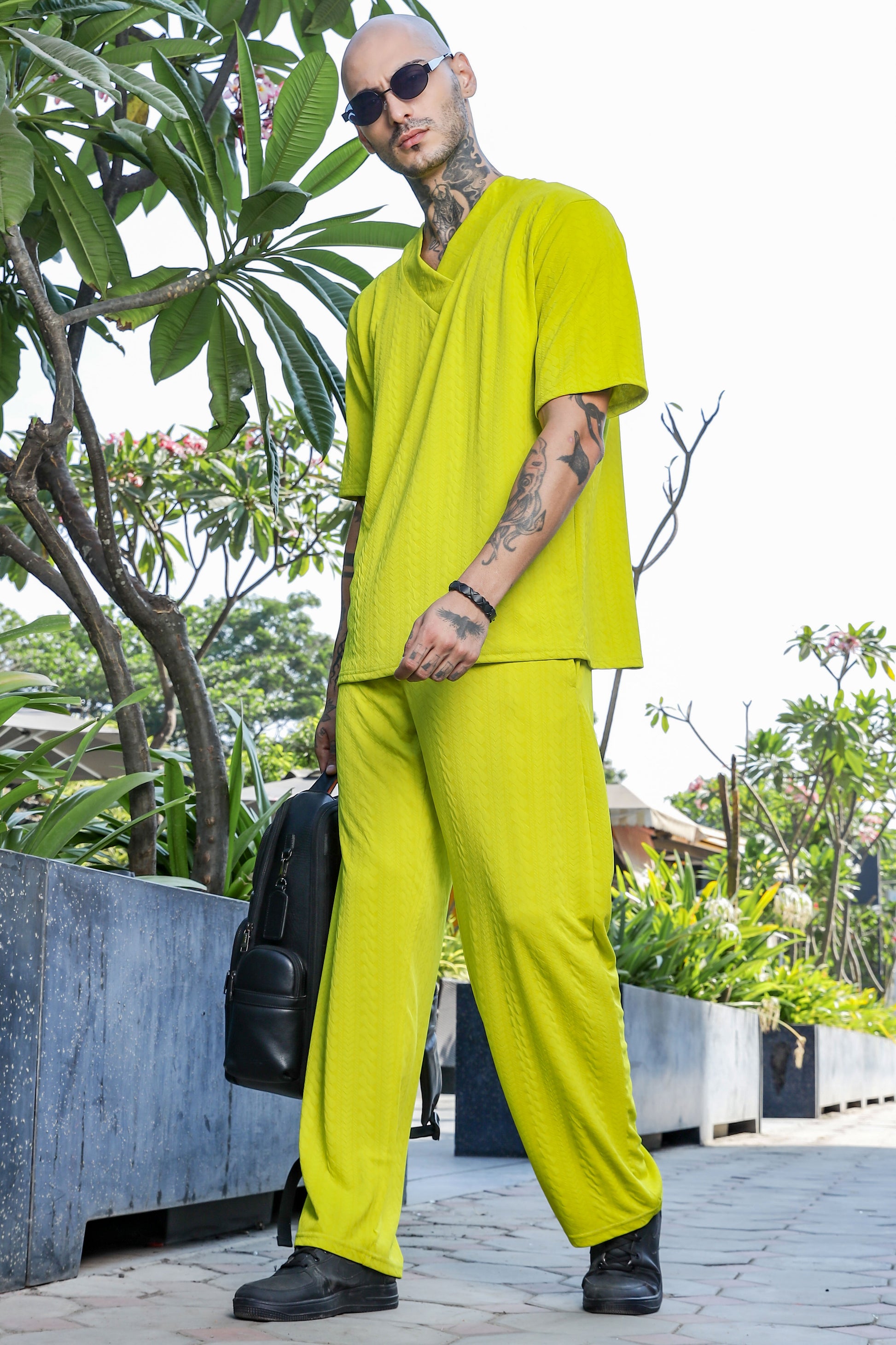 Neon Green Textured Relaxed-Fit Mid-Rise Track Pant