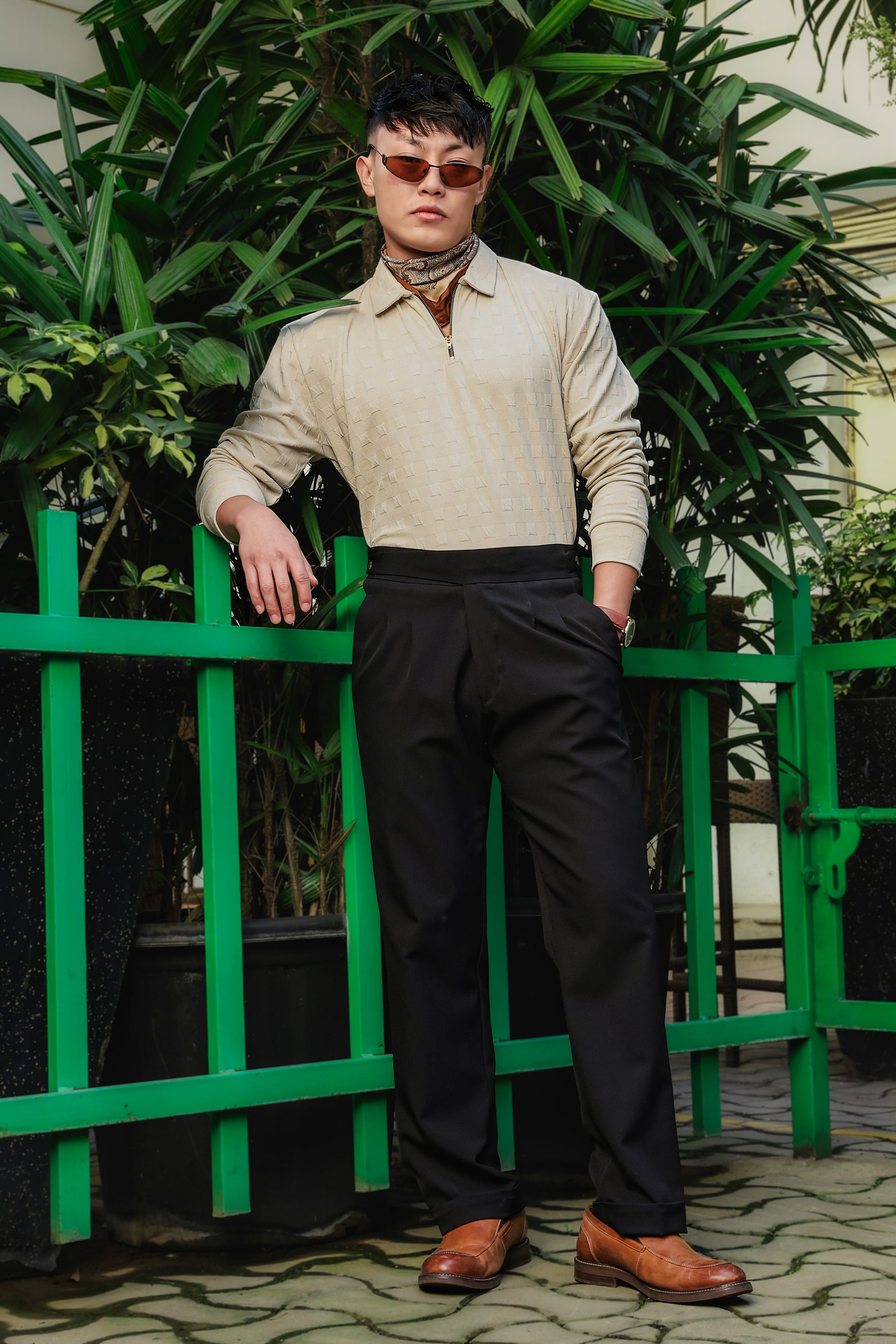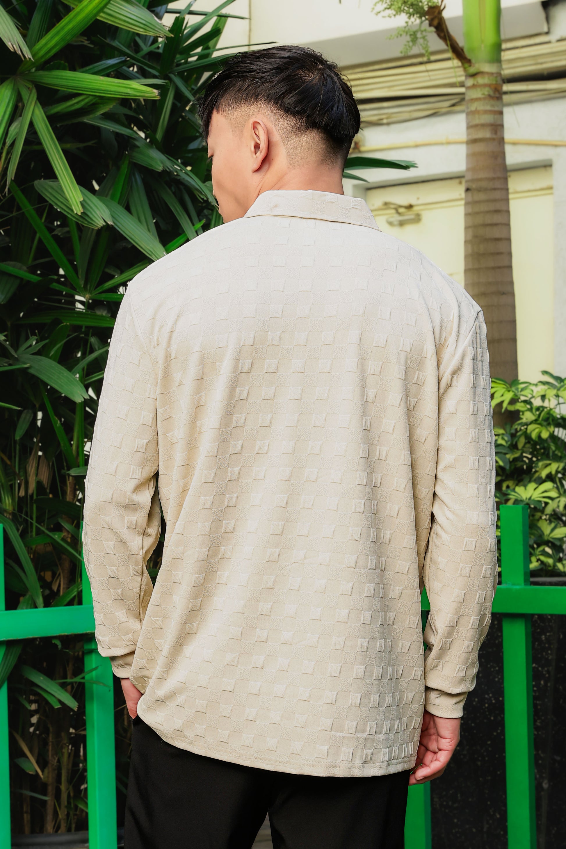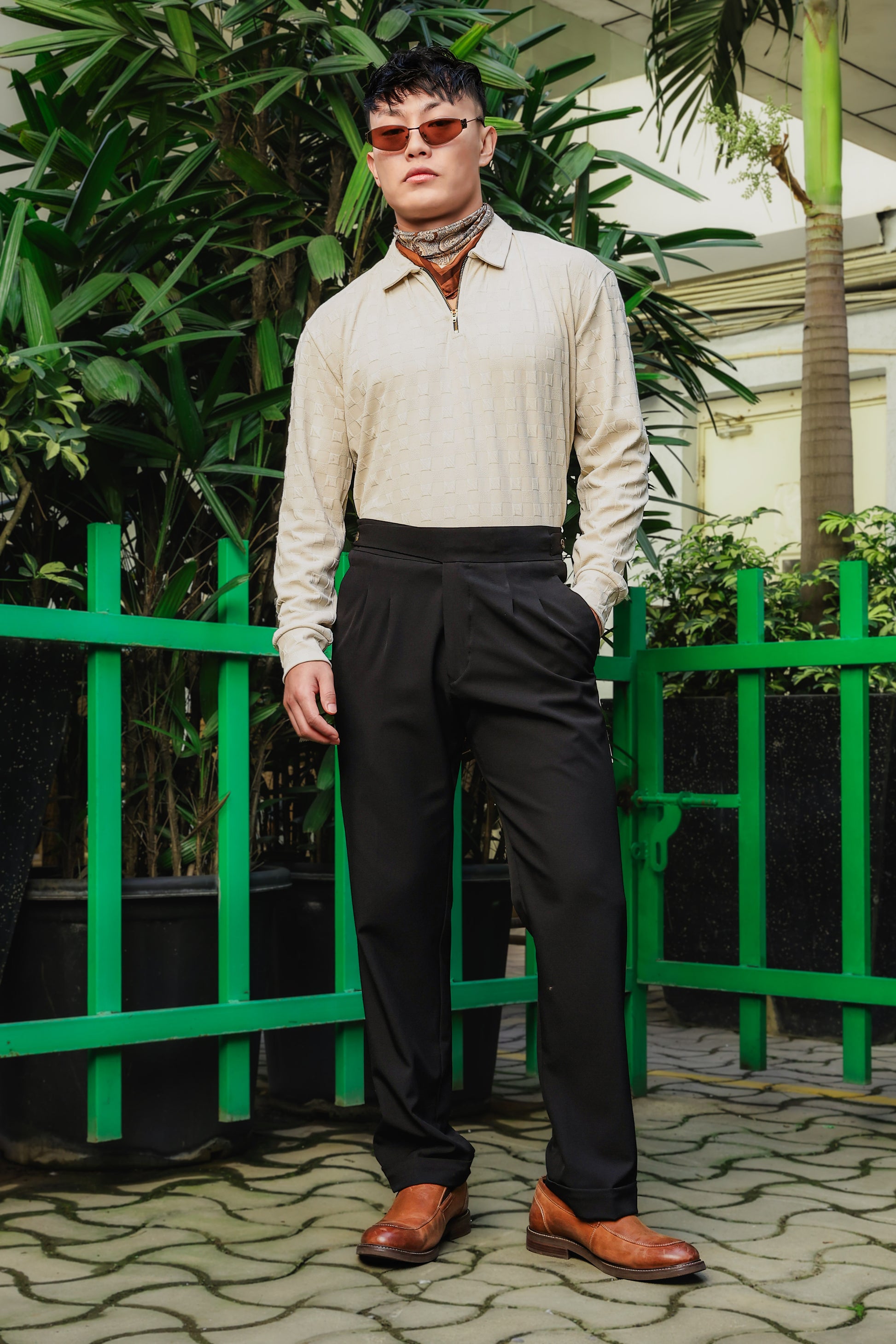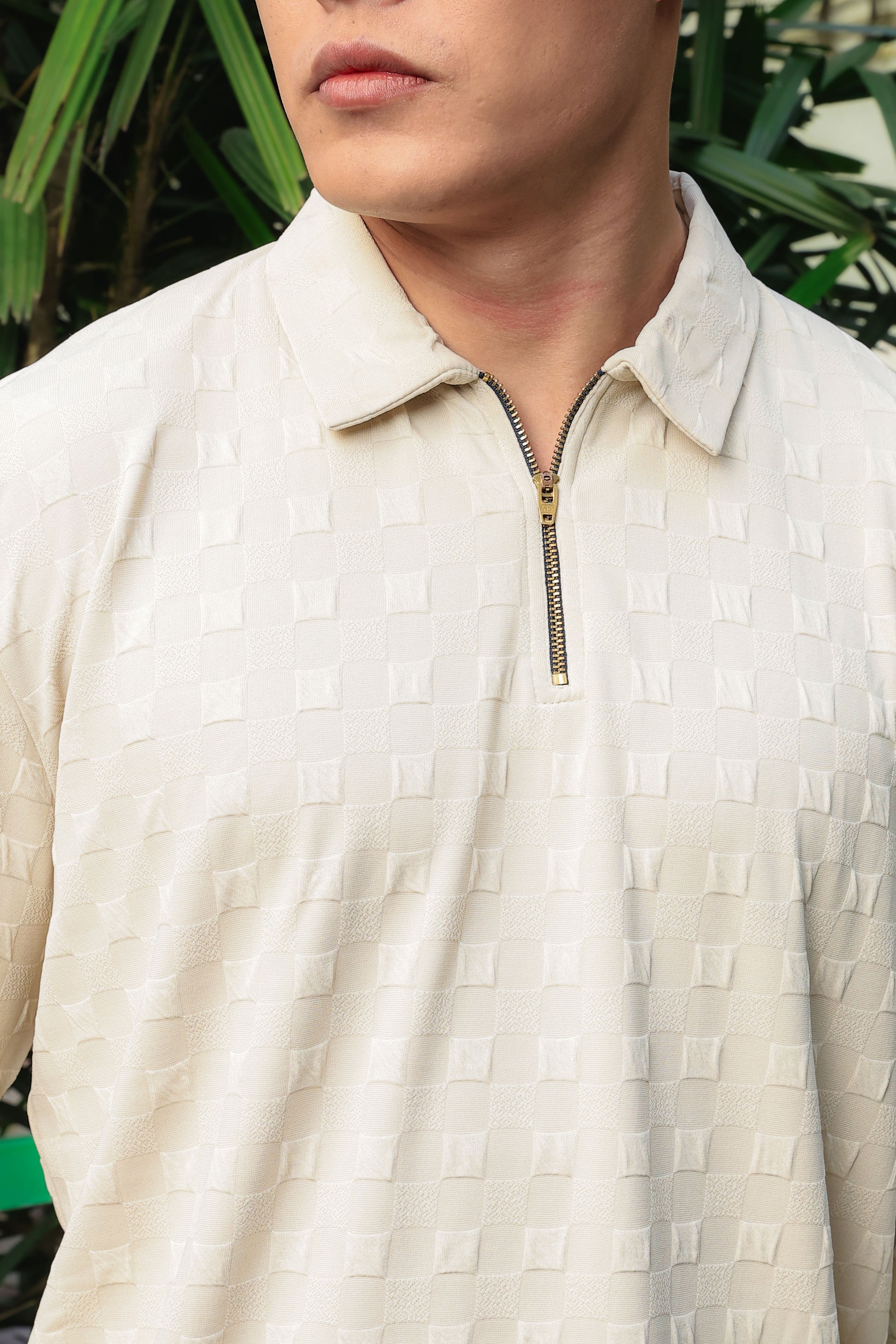 Off-White Solid Textured Cable Knit Drop-Shoulder Relaxed Fit Polo Neck Full Sleeve T-Shirt