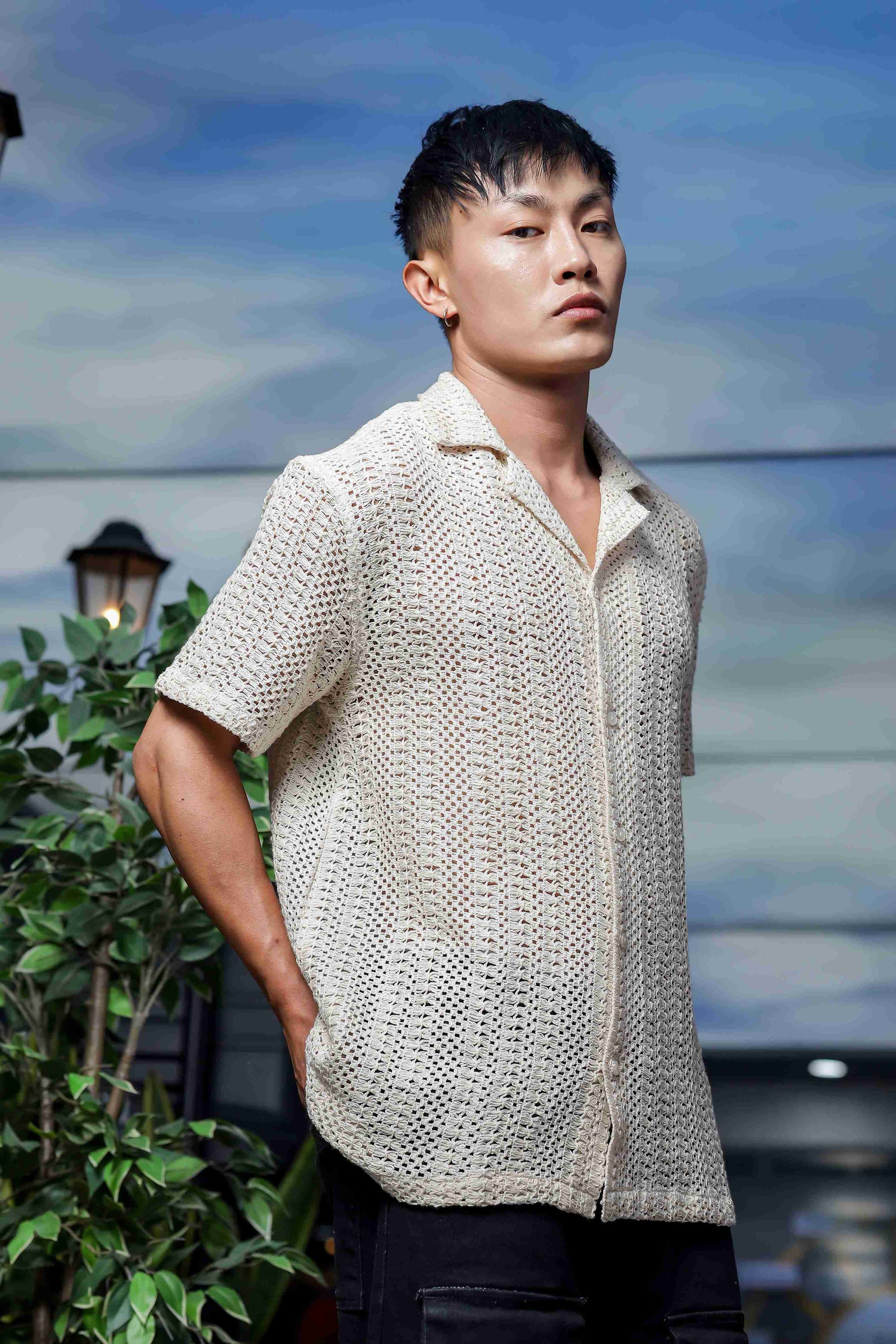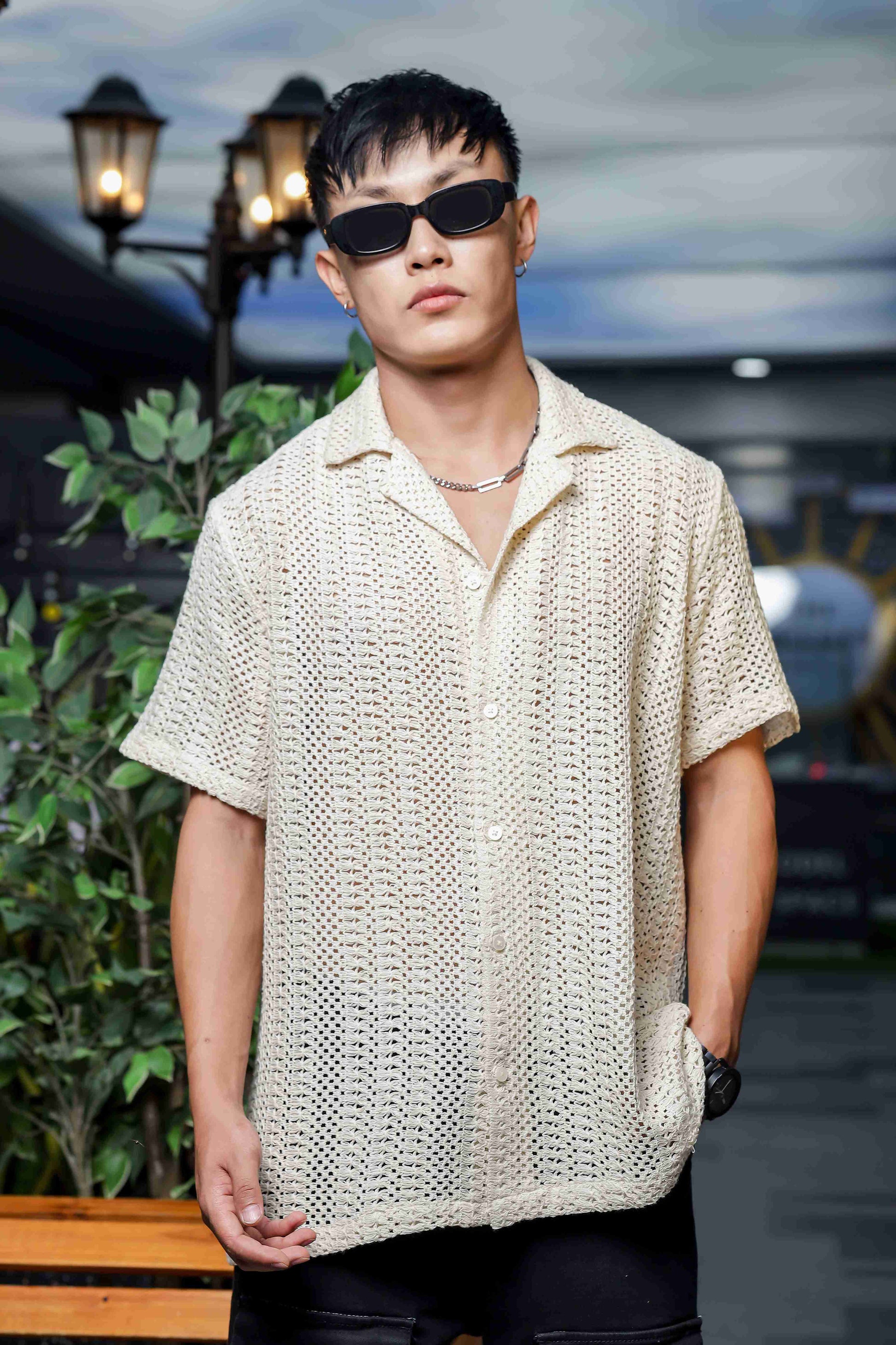 Off White Relaxed Fit Cotton Crochet Resort Shirt