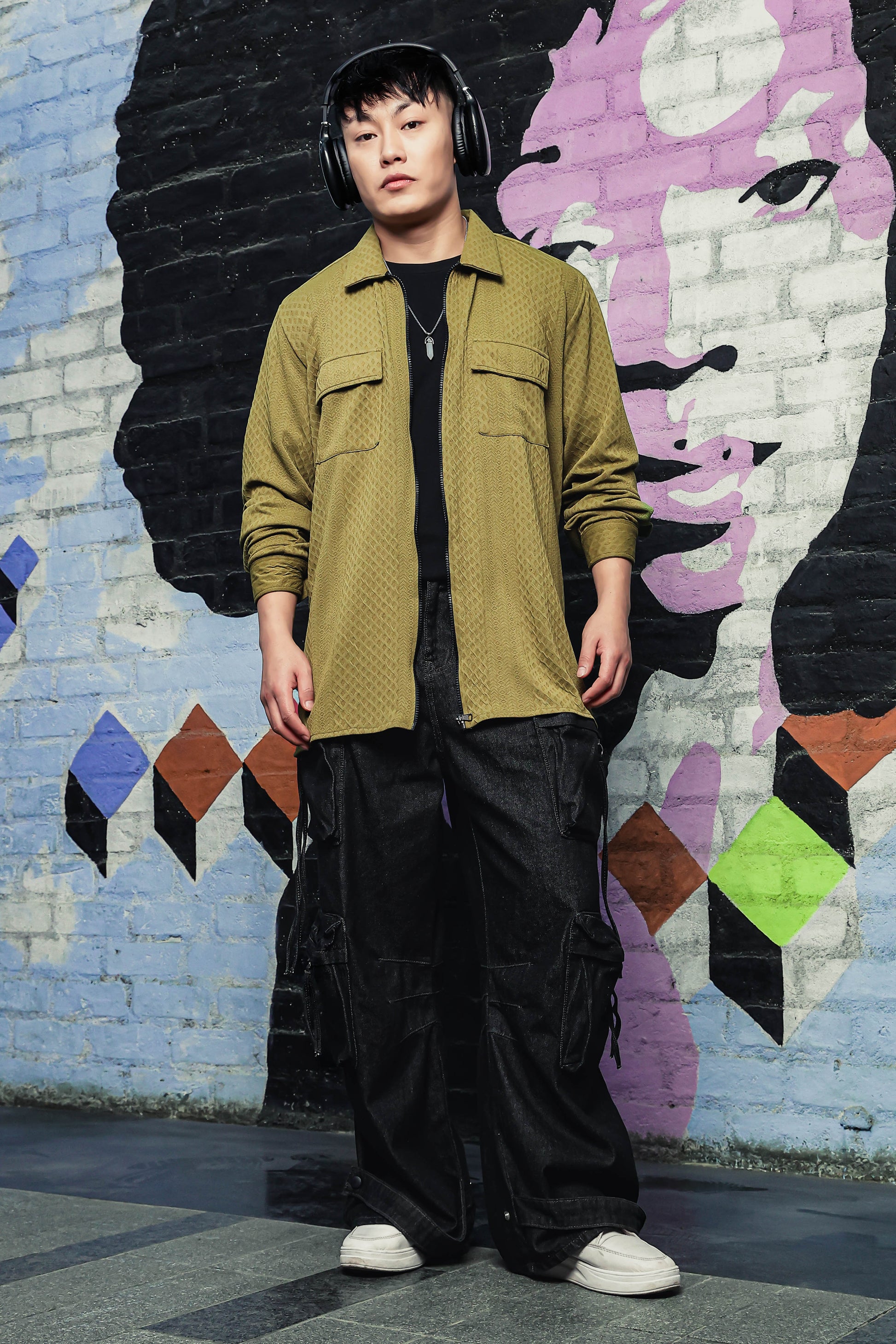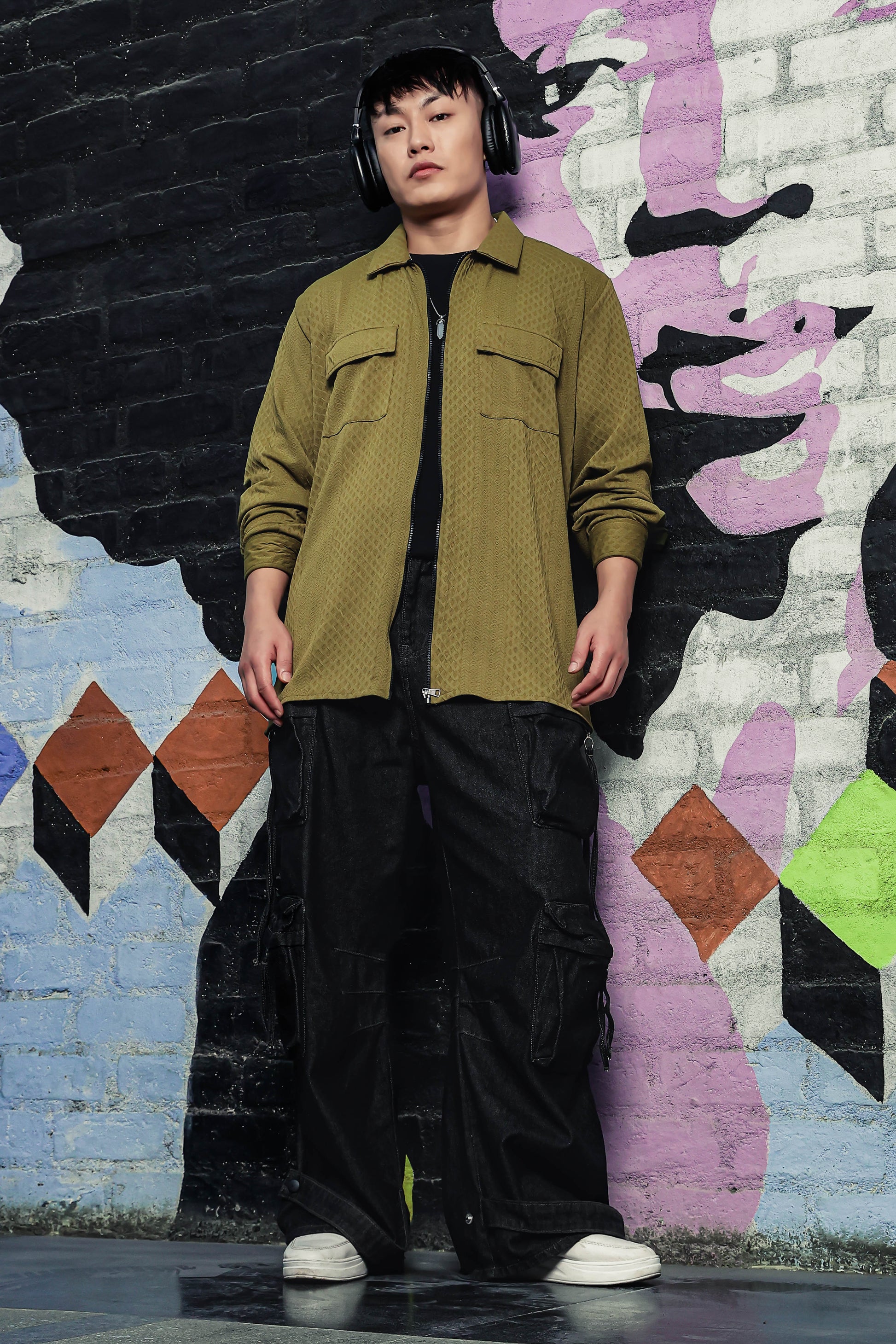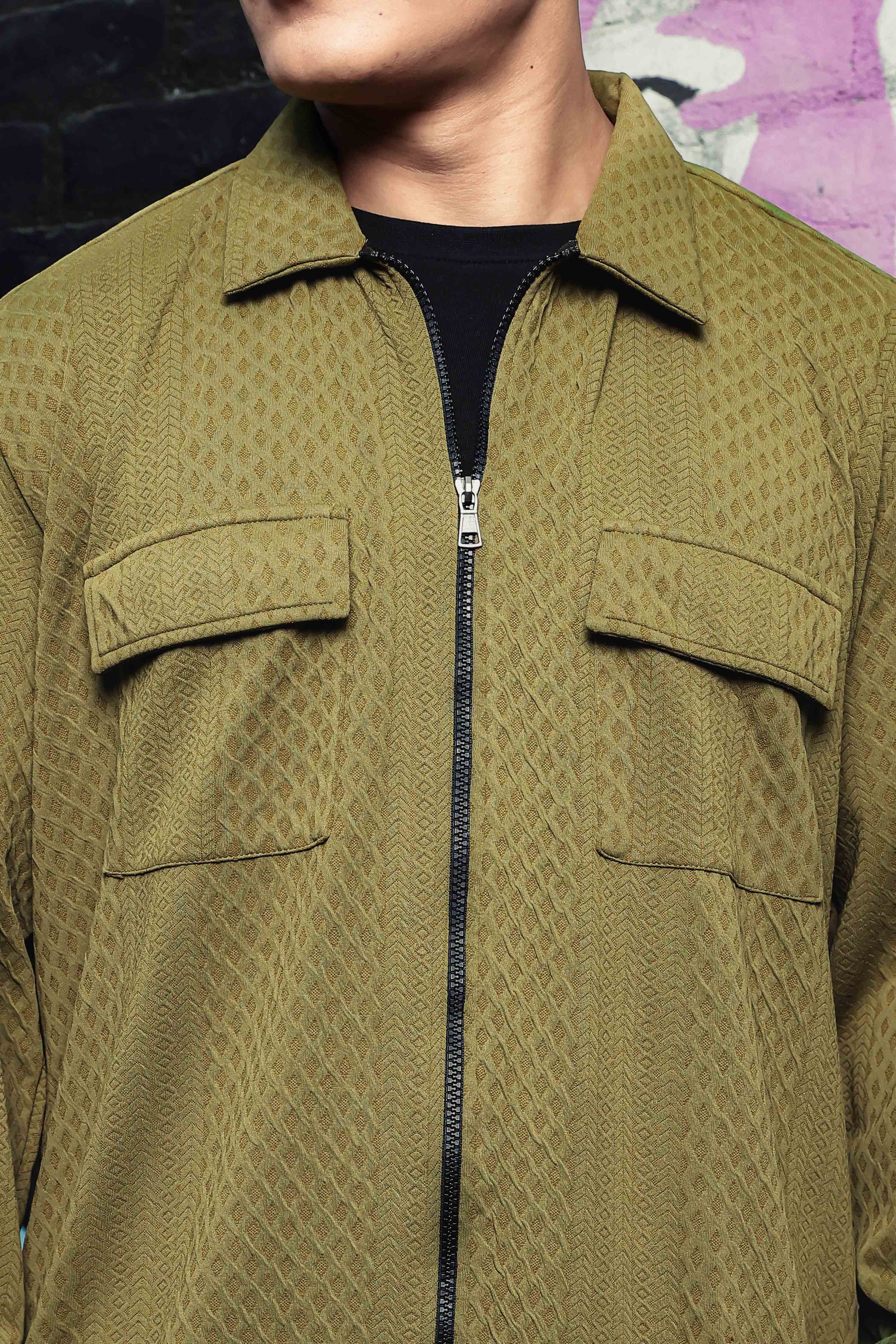 Olive Textured Drop-Shoulder Relaxed Fit Shirt Zipper Shacket
