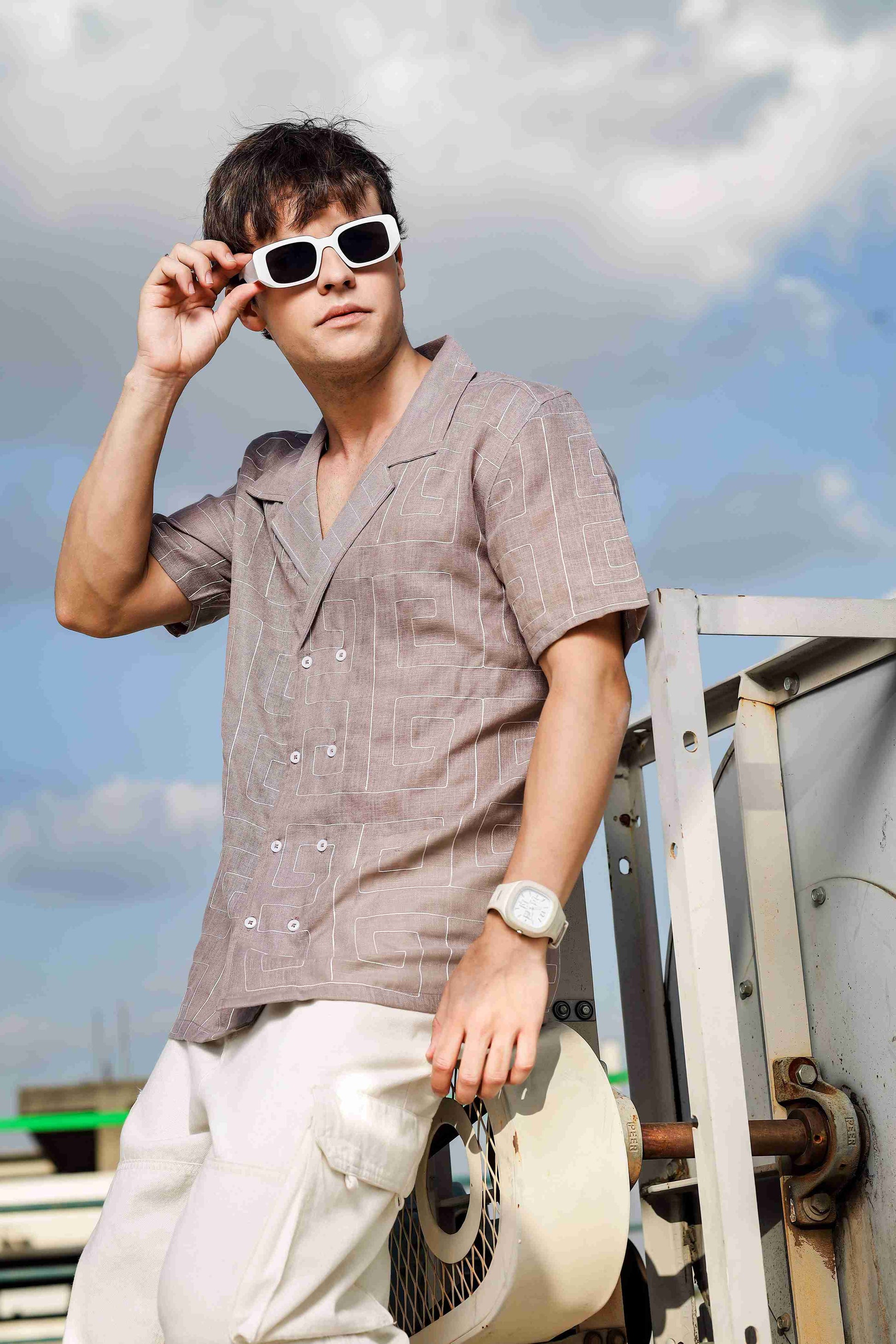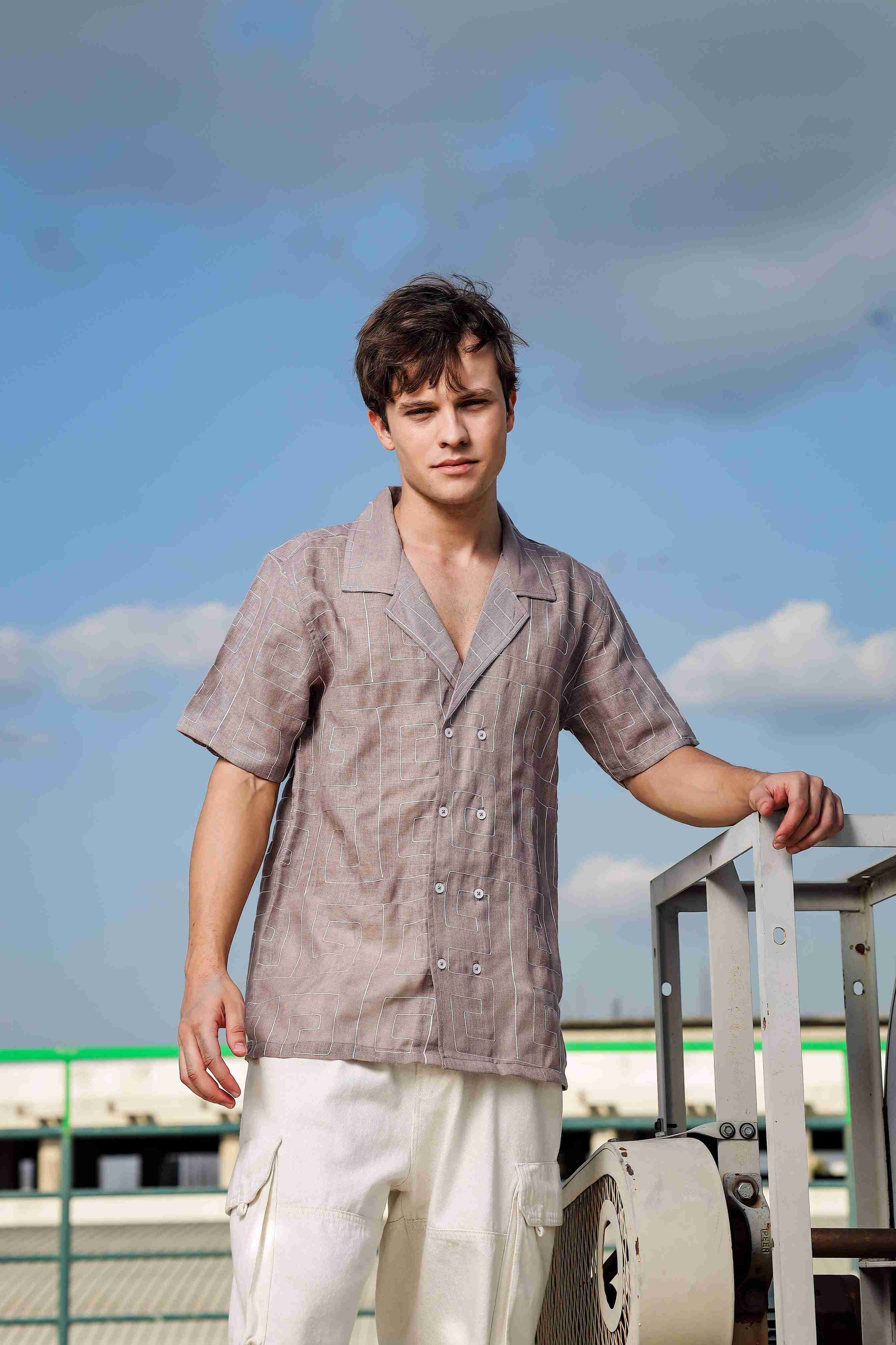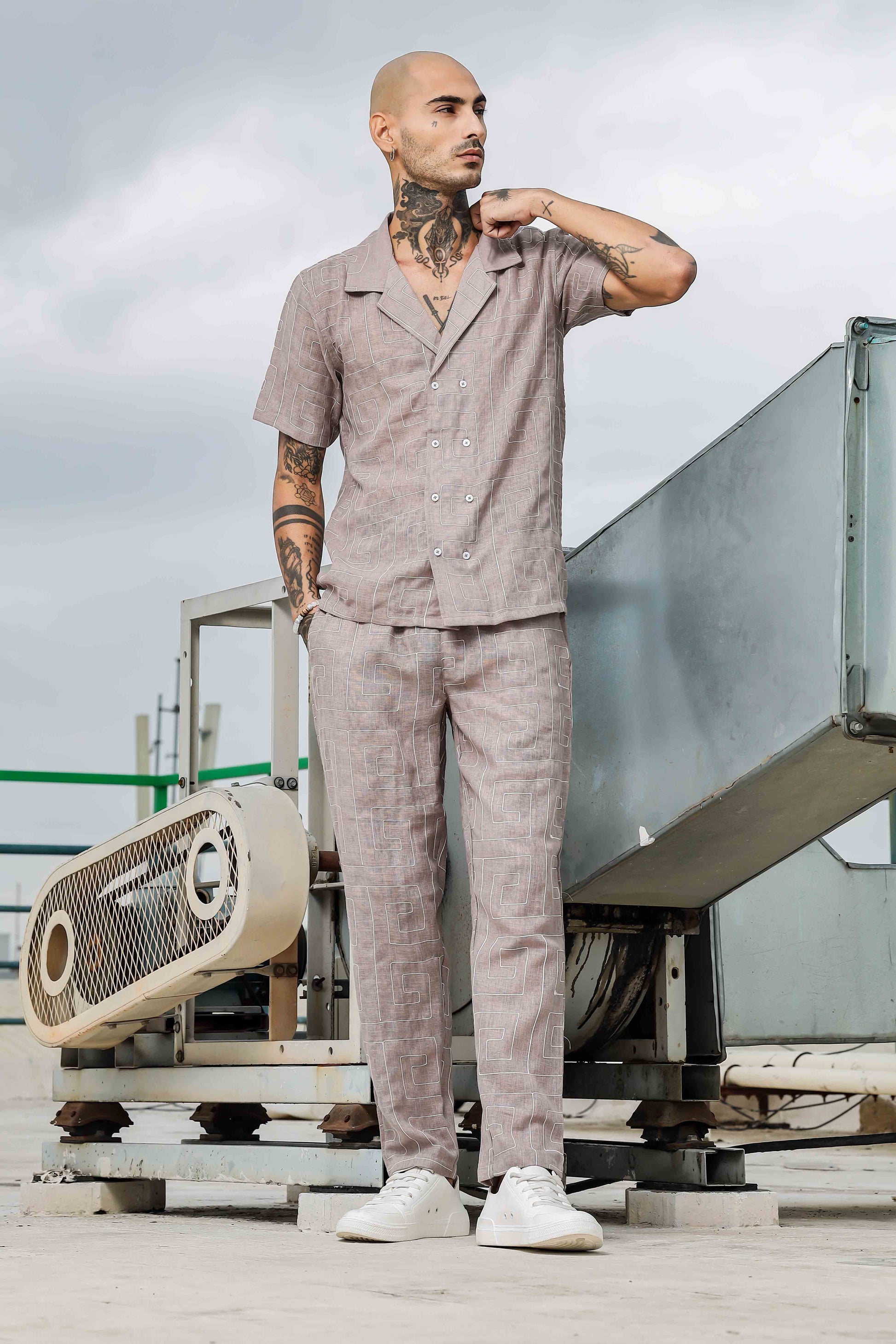 This must have coord set consists of a Relaxed half sleeve shirt with lounge pants.Relaxed-fit shirt in a patterned Linen Embroidered weave with a resort collar, Lapel front, short sleeves and a straight-cut hem. Beige Linen Embroidered mid-rise lounge pants, has an inner elasticated waistband with drawstring closure and two slant pockets on side and one pocket at the back