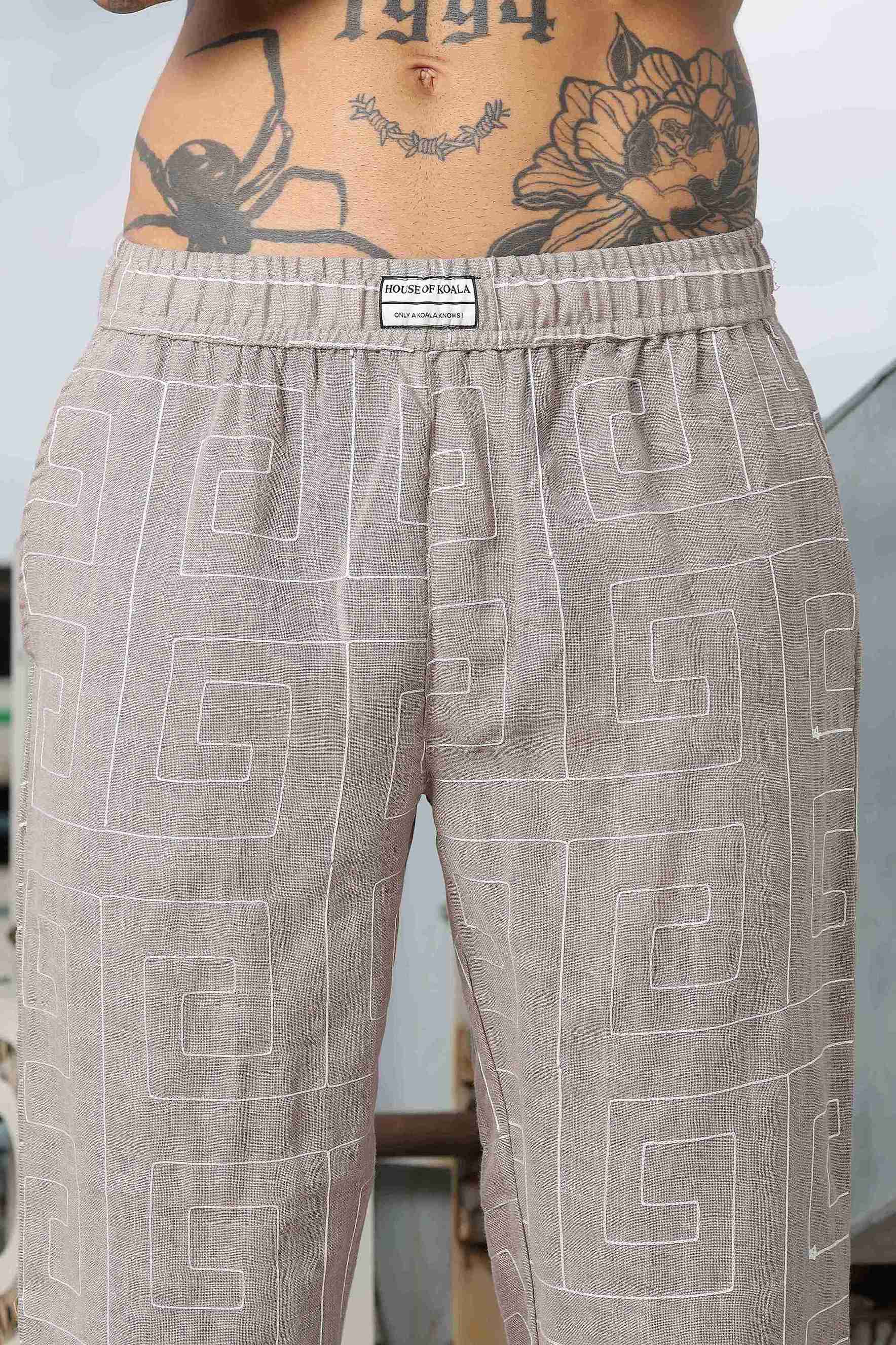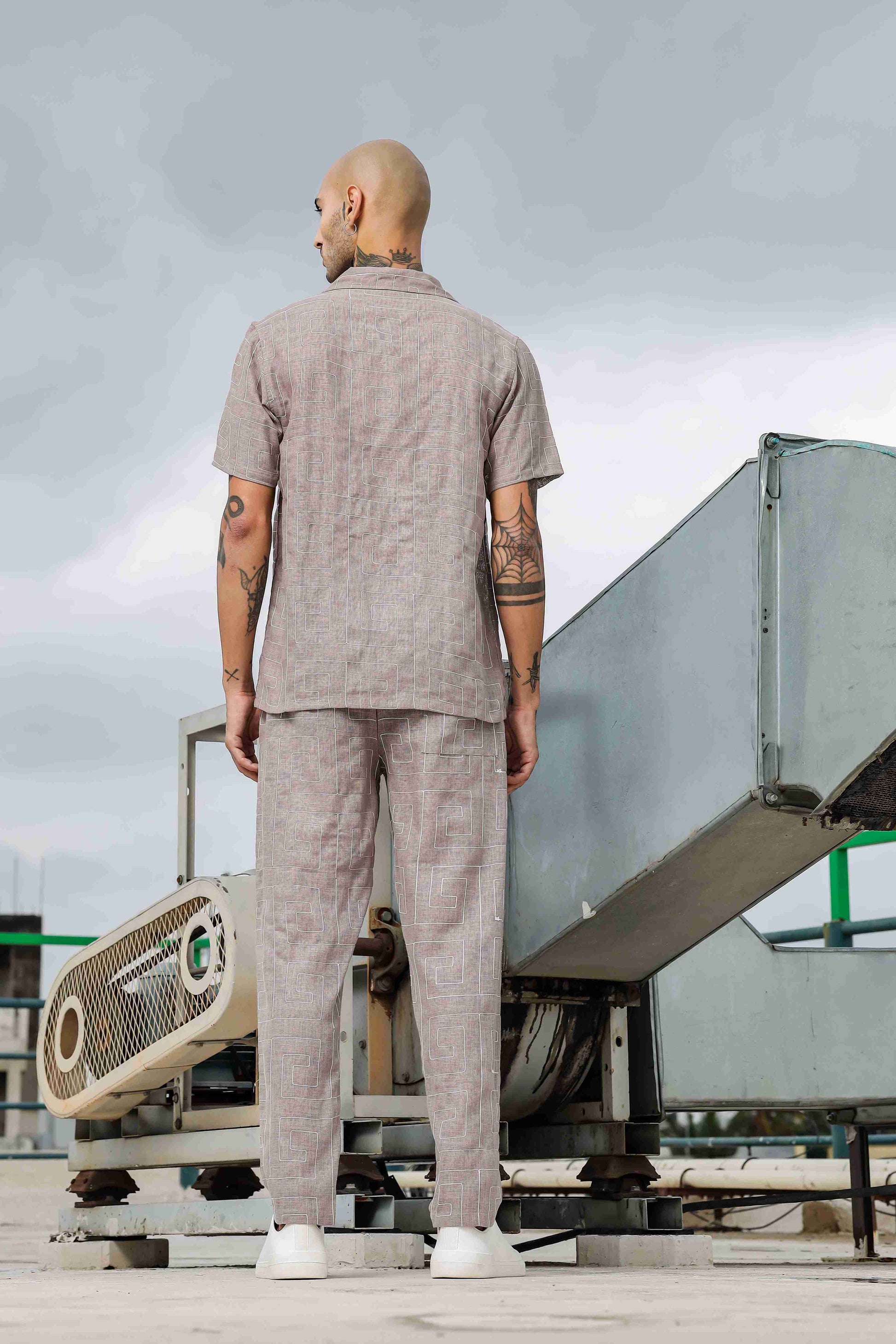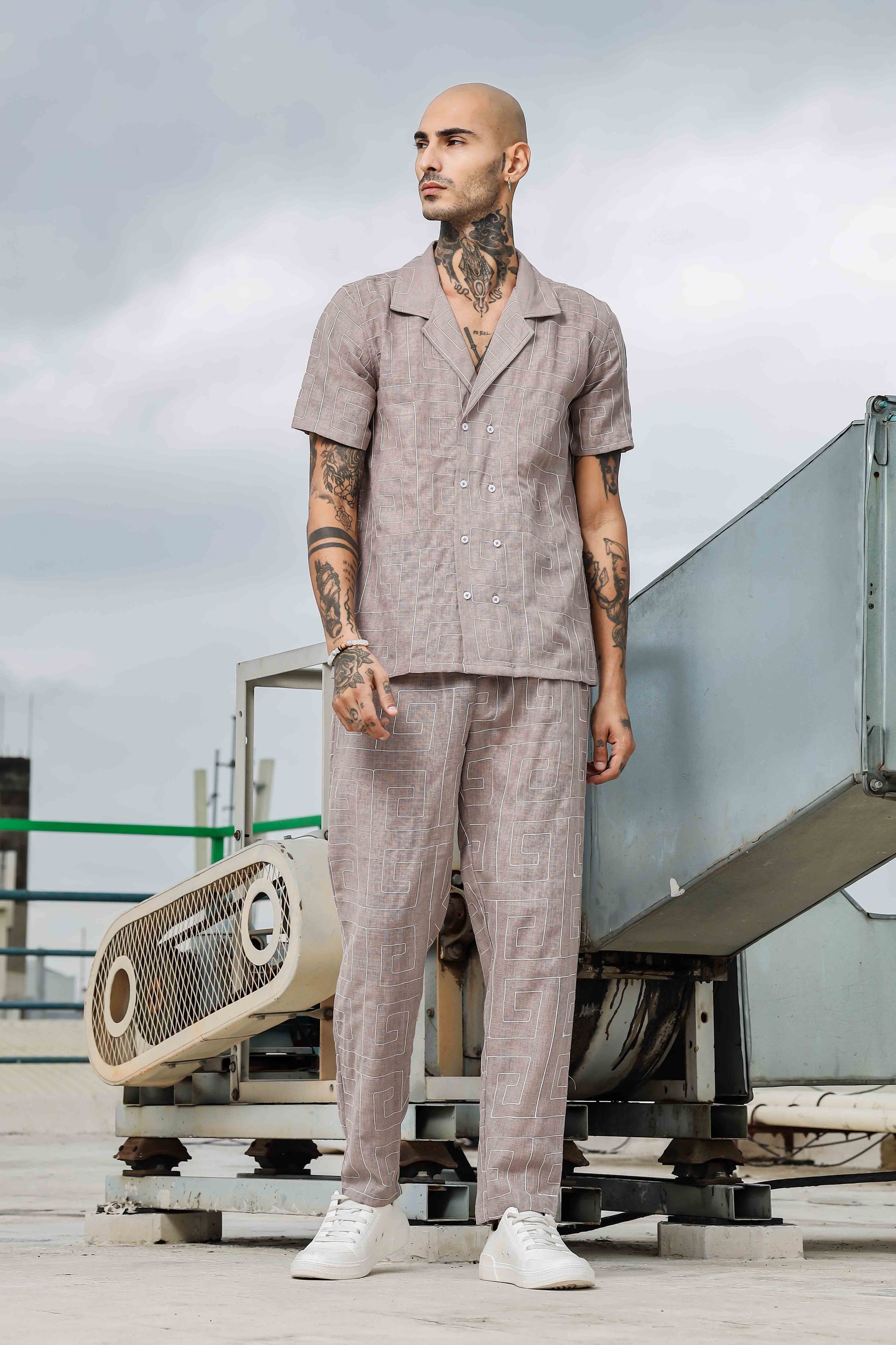 Beige Linen Notched Lapel Shirt & All Day Lounge Pants Embroidered Co-ord Set