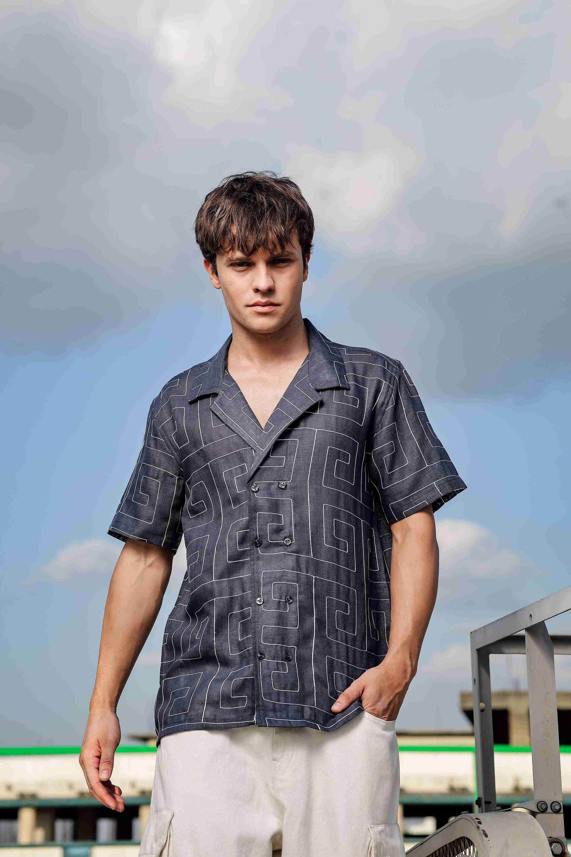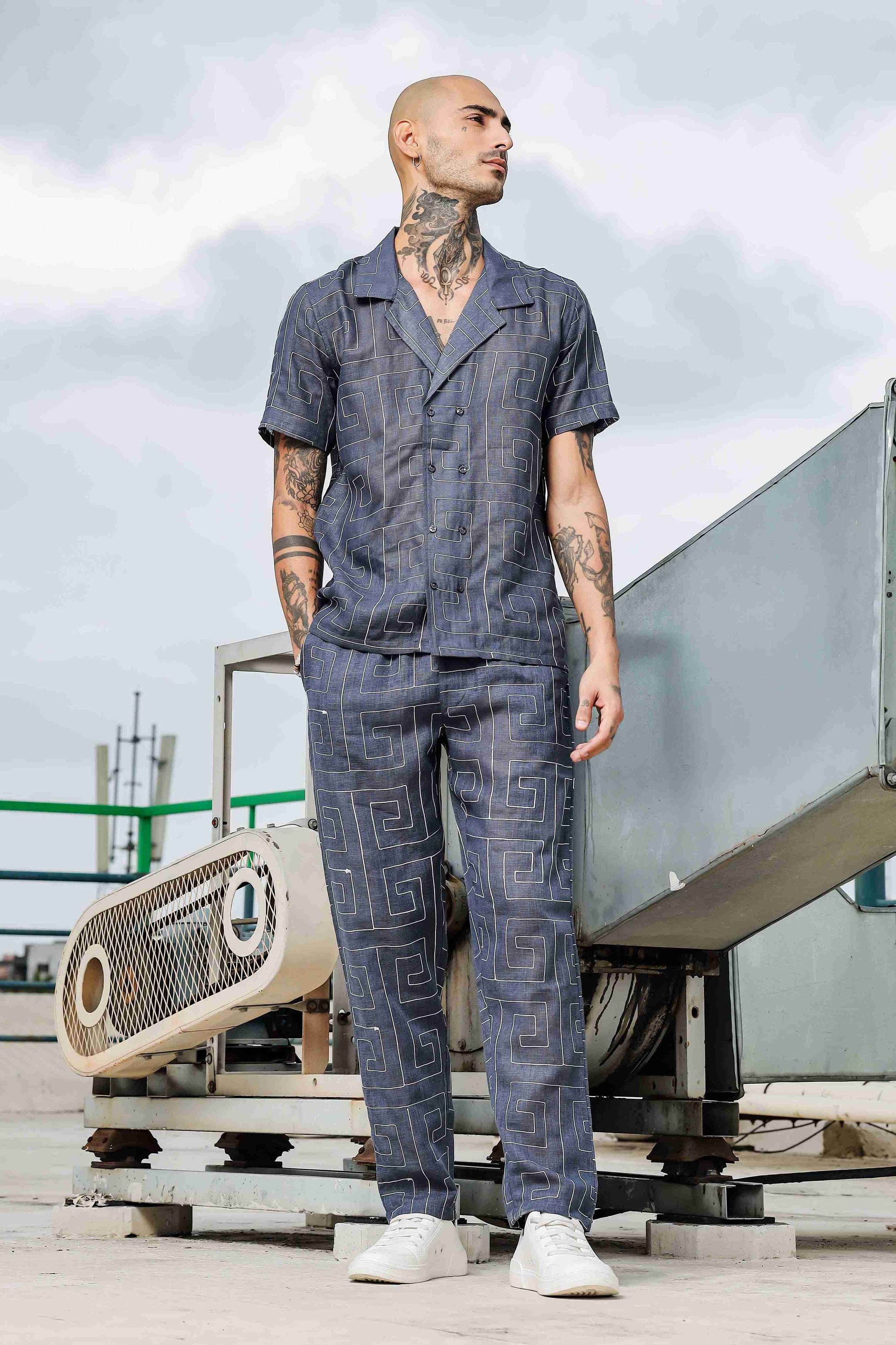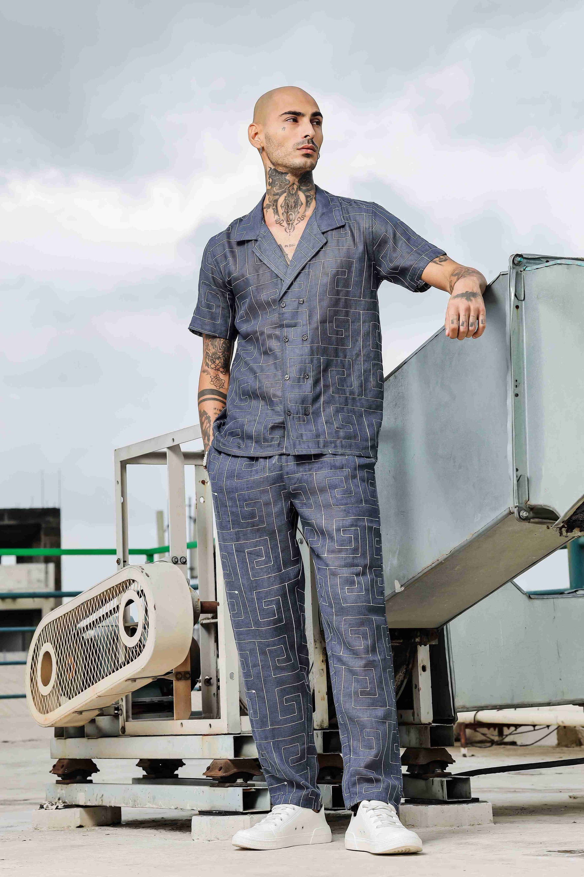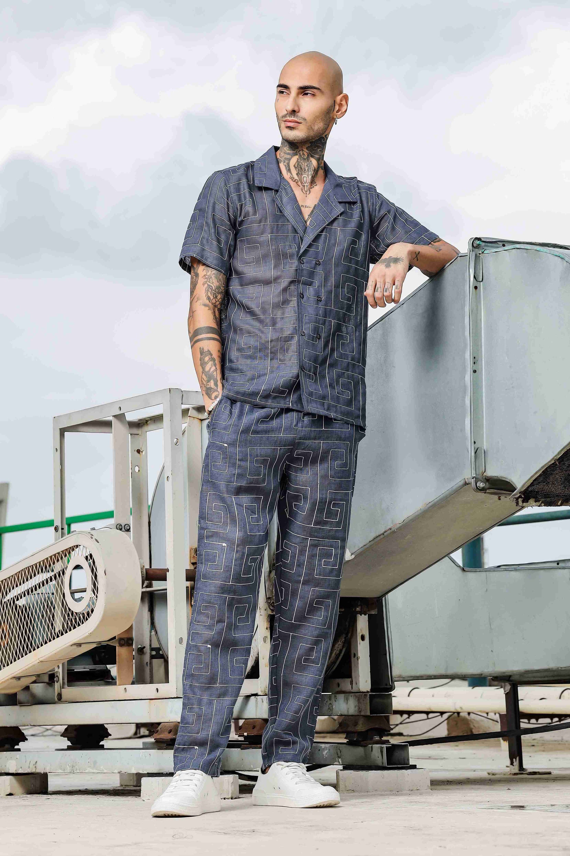 This must have coord set consists of a Relaxed Notched Lapel half sleeve shirt with all day pants.Relaxed-fit shirt in a patterned Linen Embroidered weave with a notched lapel collar, Lapel front, short sleeves and a straight-cut hem. Blue Linen Embroidered mid-rise lounge pants, has an inner elasticated waistband with drawstring closure and two slant pockets on side and one pocket at the back.