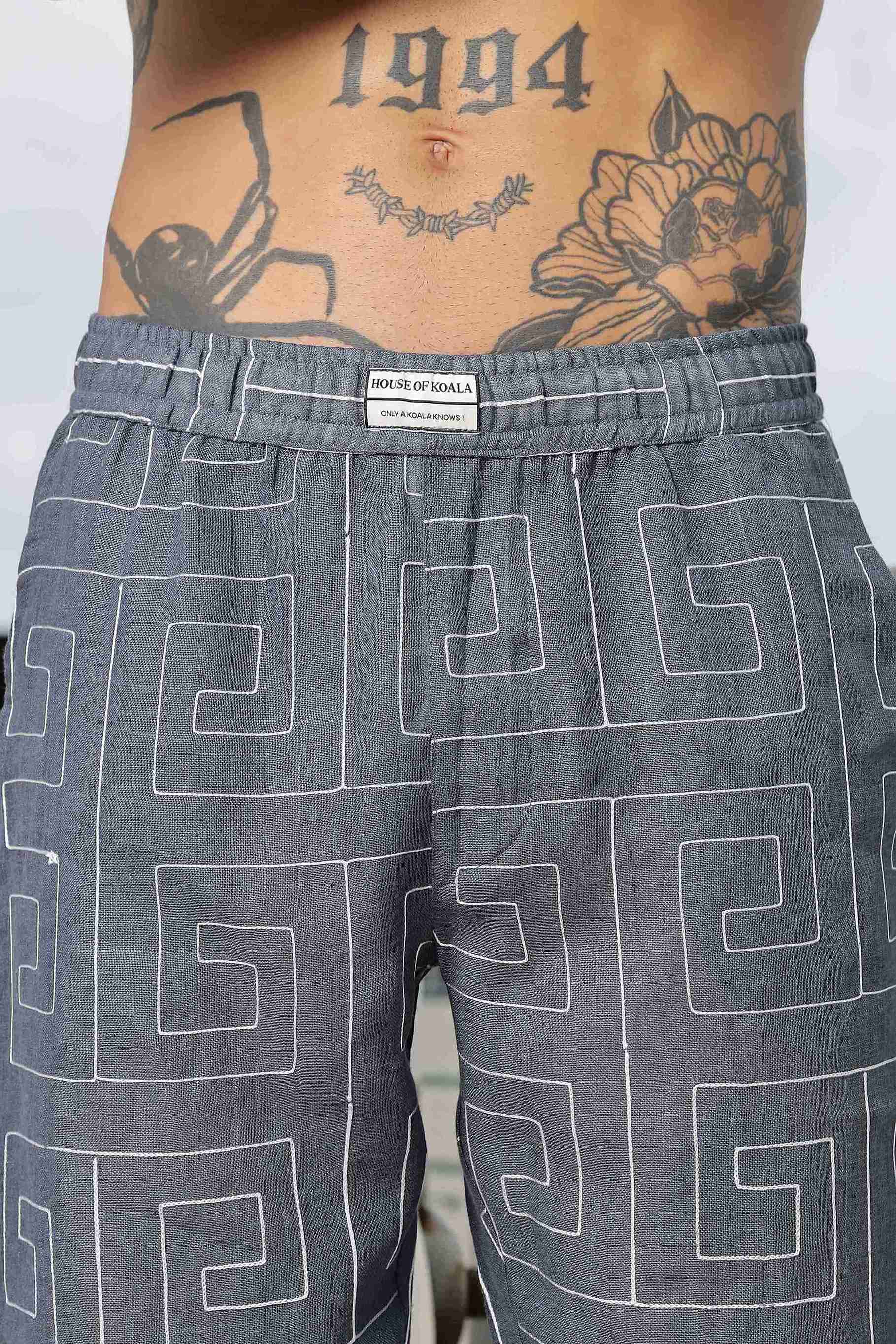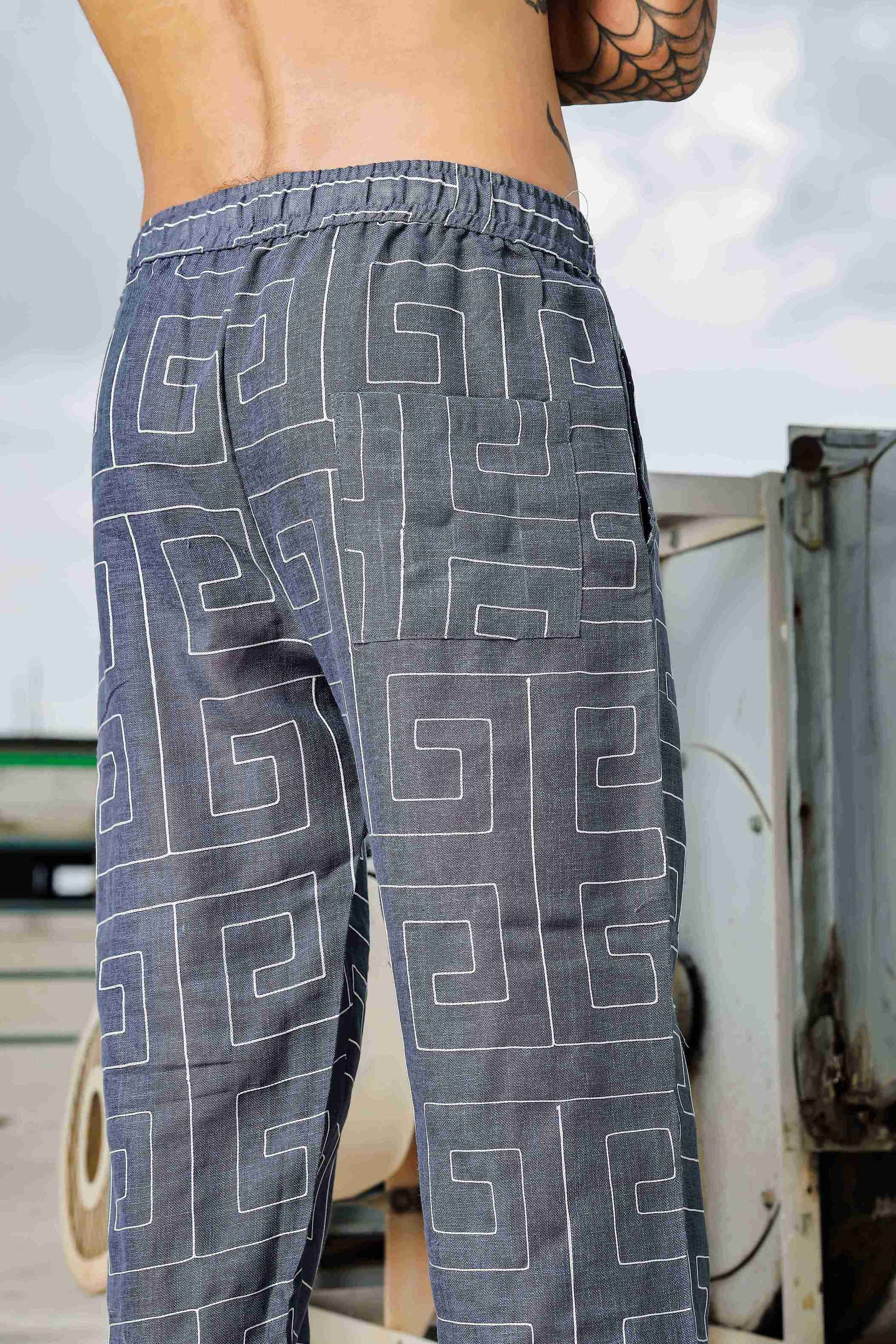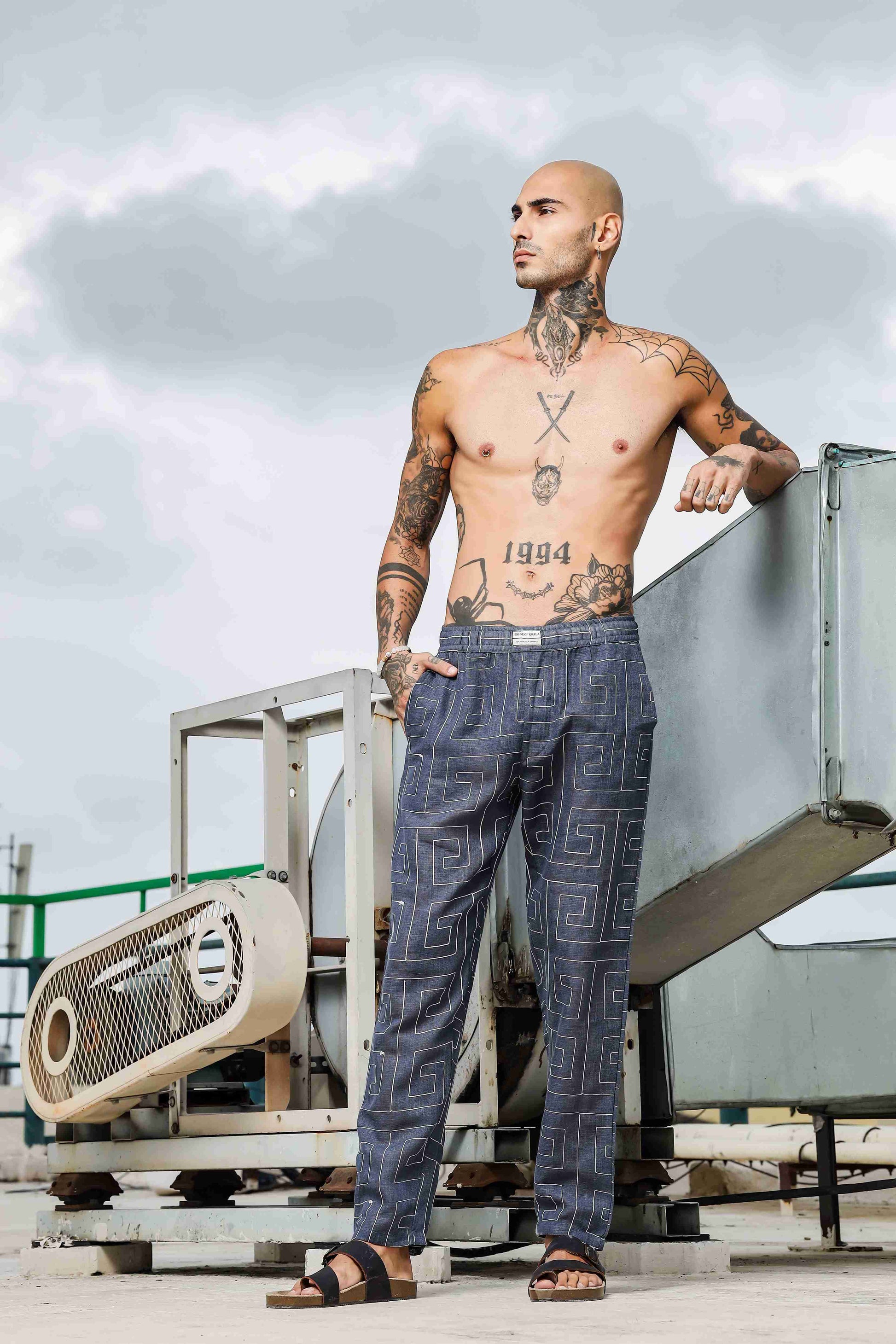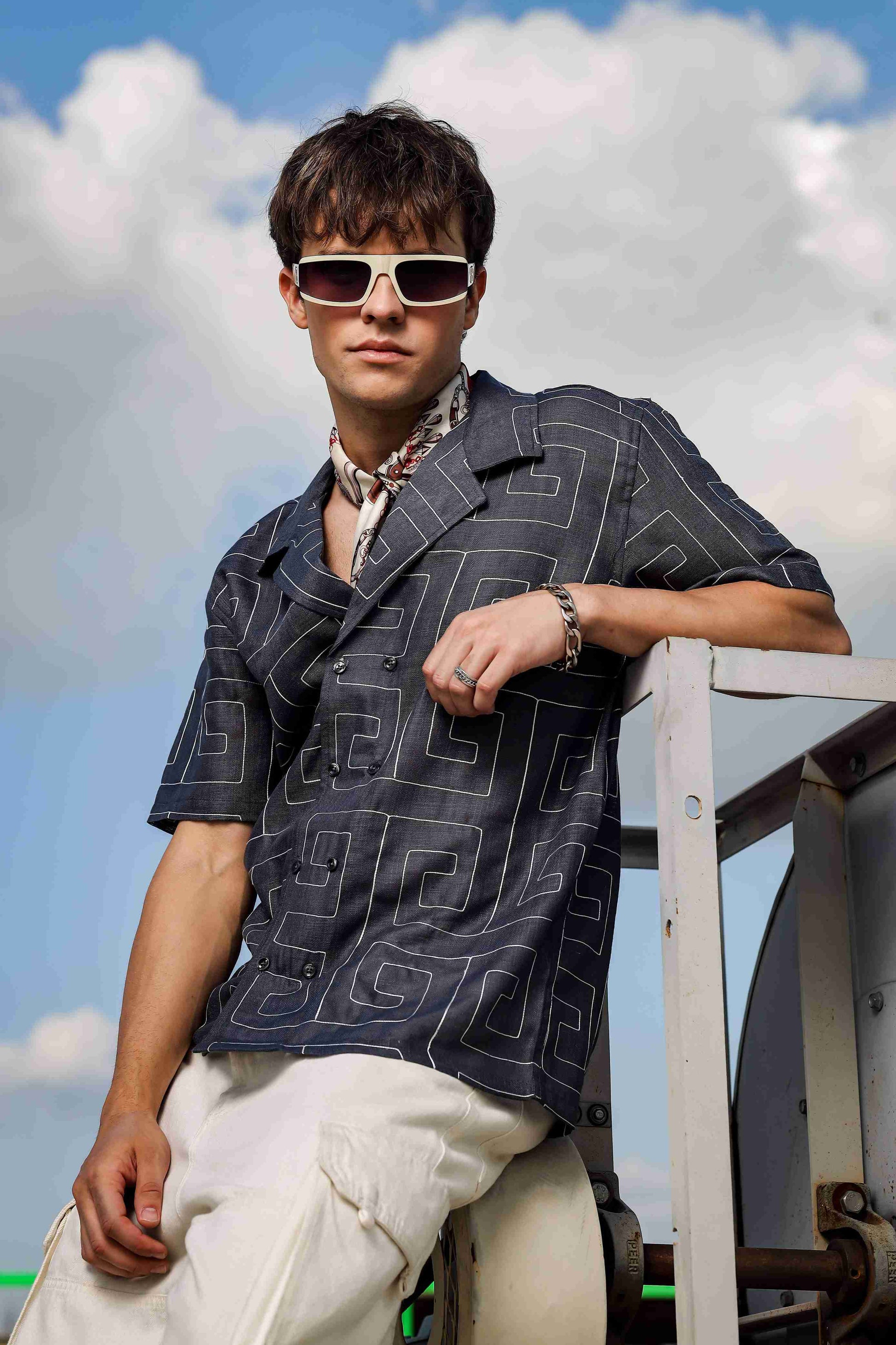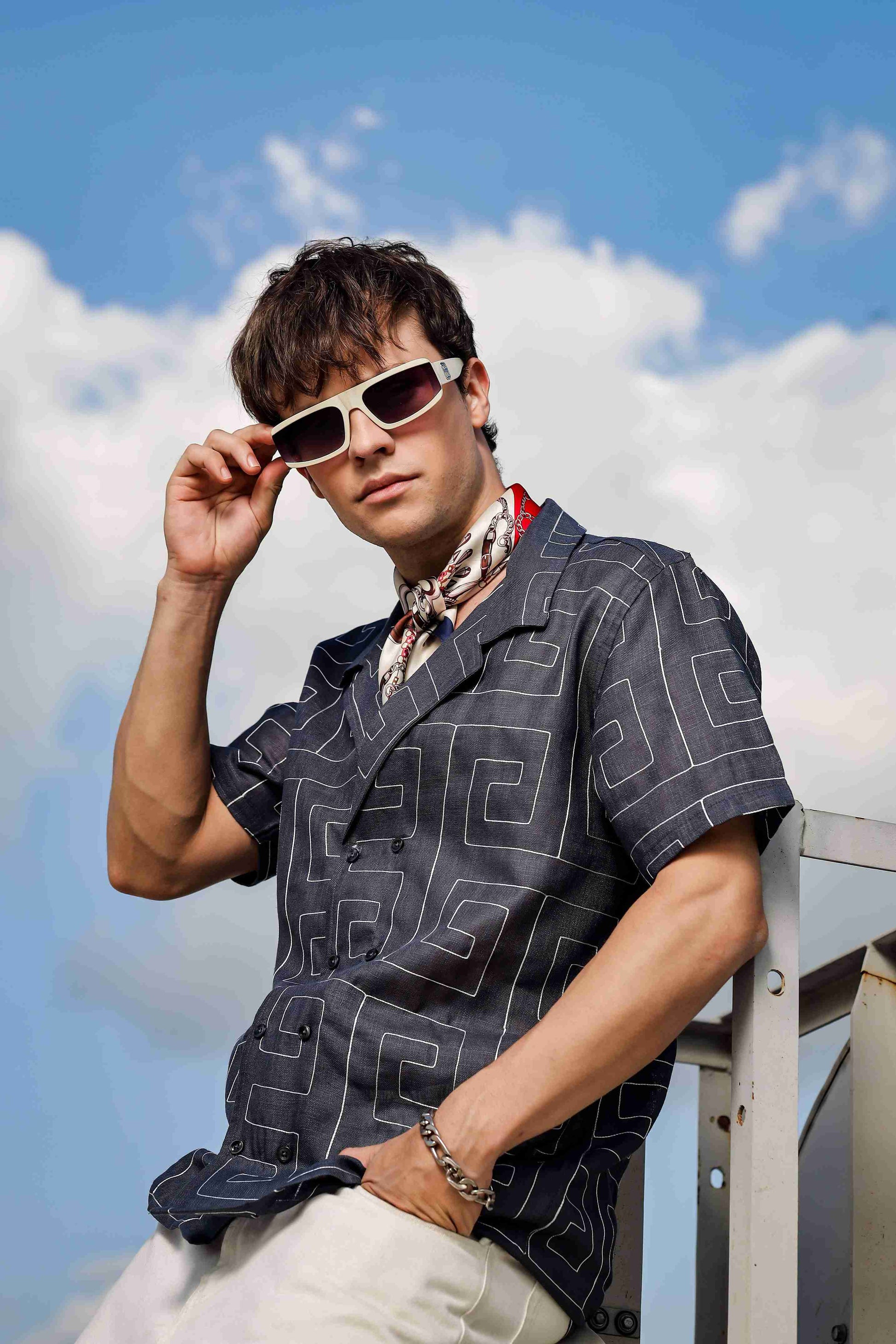 This must have coord set consists of a Relaxed Notched Lapel half sleeve shirt with all day pants.Relaxed-fit shirt in a patterned Linen Embroidered weave with a notched lapel collar, Lapel front, short sleeves and a straight-cut hem. Blue Linen Embroidered mid-rise lounge pants, has an inner elasticated waistband with drawstring closure and two slant pockets on side and one pocket at the back.